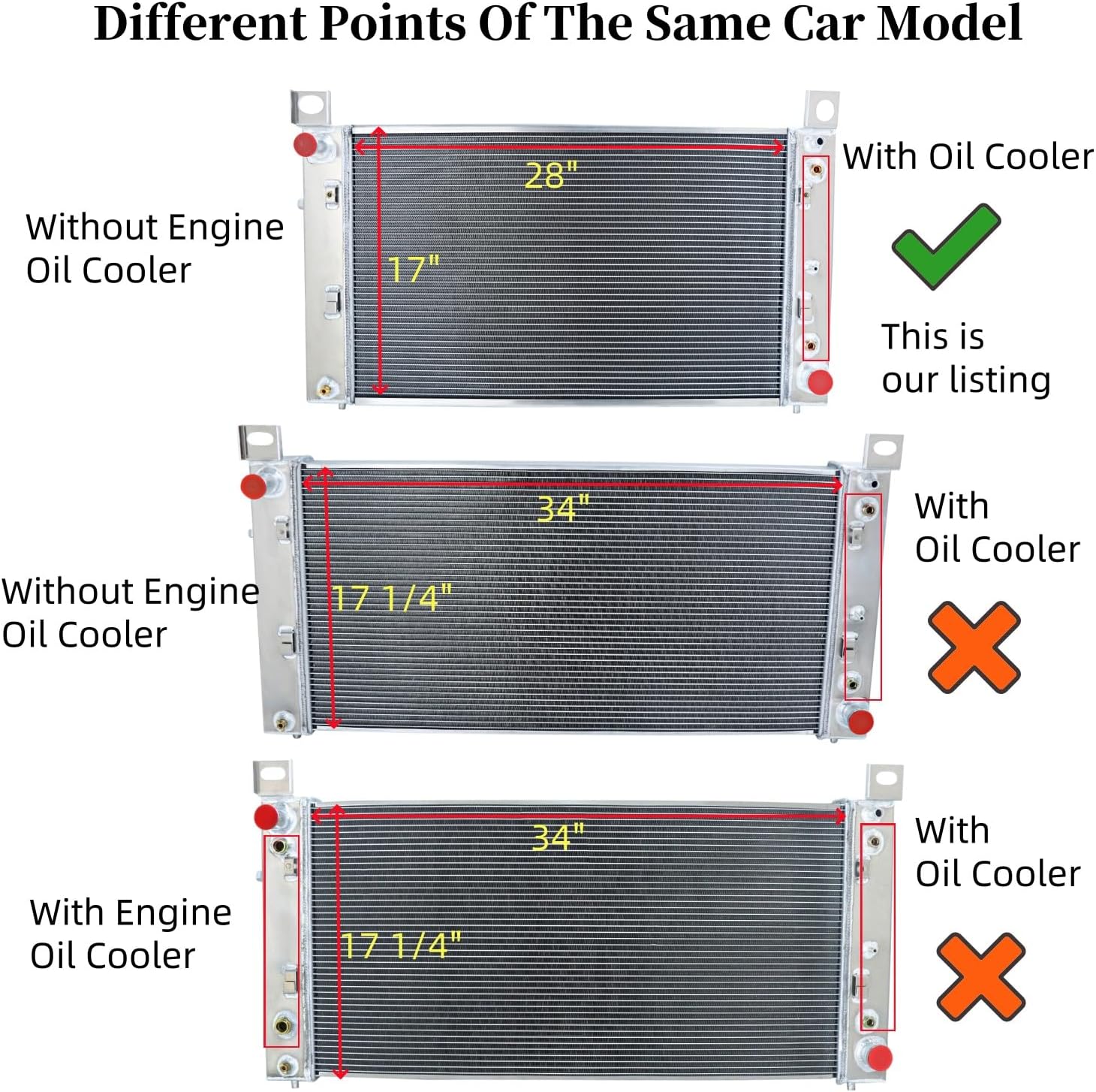 Vehicle Fitment:Compatible with CADILLAC ESCALADE 2002-2005Compatible with CHEVROLET SILVERADO 1500 1999-2013Compatible with CHEVROLET SILVERADO 1500 CLASSIC 2007Compatible with CHEVROLET SILVERADO 2500 1999-2000Compatible with CHEVROLET SUBURBAN 1500 2000-2006Compatible with CHEVROLET TAHOE 2000-2006Compatible with GMC SIERRA 1500 1999-2007Compatible with GMC SIERRA 1500 CLASSIC 2007Compatible with GMC SIERRA 2500 1999-2000Compatible with GMC YUKON 2000-2006Compatible with GMC YUKON XL 1500 2000-2006Radiator Detail:High Performance Racing Spec.3-Row of tubes Core Racing DesignPetock Drain:OEM style brass petcock drainCore size: 28-3/8" x 17-5/8" Overall size: 35-5/8" x21-1/2"Inlet/Outlet: 1-3/8"/ 1-1/2"Include trans cooler TRANSMISSION COOLER: YES φ26*292*G3/8-19(Z)ENGINE OIL COOLER: NOFan Size:Maximum Fan CFM: 1730 cfmFan Diameter (in): 12.050”Thickness (in): 2.500”Number of Blades: 10 bladesMaximum Fan RPM: 2,250 rpmBlade Material: PlasticAmp Draw: 12.70 ampsIncludes the Mounting Tabs for an Easy Zip Tie InstallationThermostat Kit:Universal fit for any automotive vehicle and electric fan.Activates by grounding electric fans at preset temperature.180'F turn-on temperature, 165'F turn-off temperature.RED + connect directly to battery.WHITE wire to ignition switch power source.BLACK goes to thermos switch.BLUE wire goes to the Fans.This set up will run Fans & pull air in through radiator.
