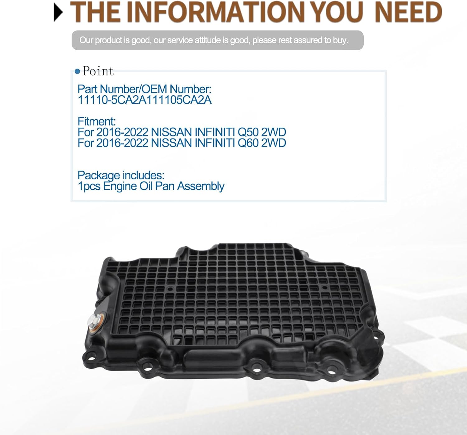 Condition: NewPart Number:11110-5CA2A111105CA2ACompatible with:2017-2022 Q60 3.0 VR30 TWIN TURBO REAR WHEEL DRIVE2016-2022 Q50 3.0 VR30 TWIN TURBO REAR WHEEL DRIVENotice:This oil pan is only compatible with RWD models, not AWD models!Package includes :1PC Engine Oil Pan Assembly