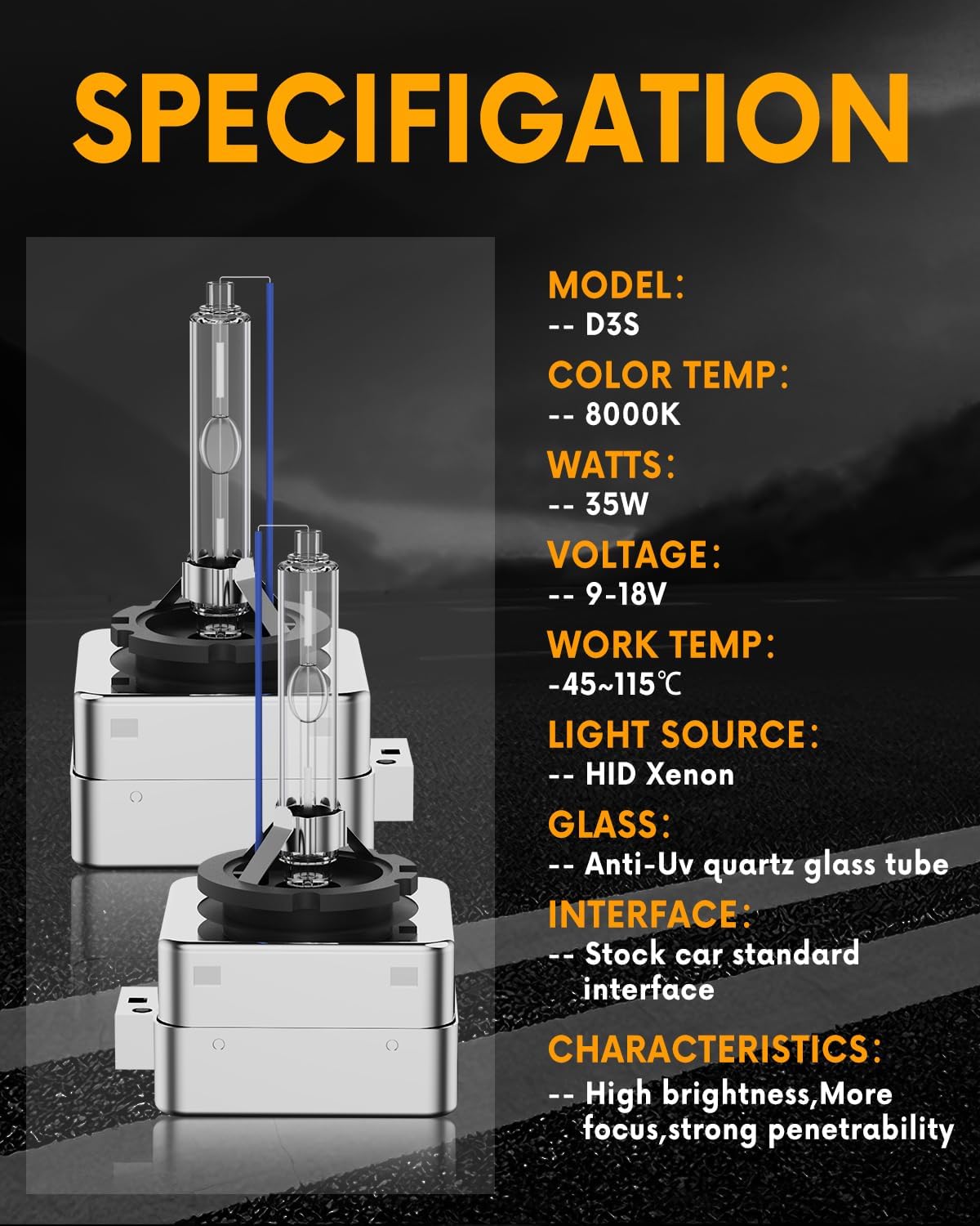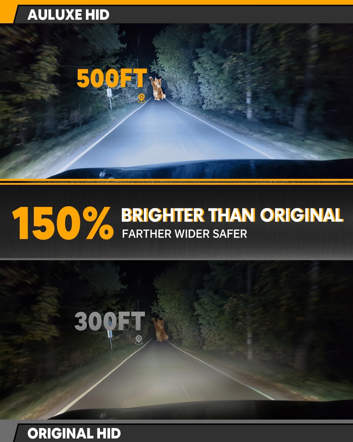 AULUXE D3S HID Headlight Bulbs feature a 150% brighter upgrade, serving as direct replacements for Ford 2011 2012 2013 2014 2015 Explorer XLT 2013 2014 F150 projector low beams (note: fits factory HID xenon systems only, not compatible with halogen setups); they also refresh the look of these models’ dual-beam front lamps as an easy upgrade kit that includes 2 premium bulbs. With 5-minute plug-and-play installation, the OEM-standard D3S bulbs match stock high/low dual-beam bi-xenon headlights for the listed models without modificatios, posing no risk of electrical damage. and are built with anti-UV quartz glass for a 3,600+ hour long lifespan. Emitting 8000K high penetration and focus white light, they provide clearer, farther-reaching visibility than stock 4300K bulbs (compatible with PK32D-5, 42302C1, 42403, 66340 specs) and feature 1-second instant-on ignition with minimal warm-up time to reach full brightness. Manufactured to strict international standards with CE, FCC, ROHS, and DOT certificatios, posing no risk of electrical damage.