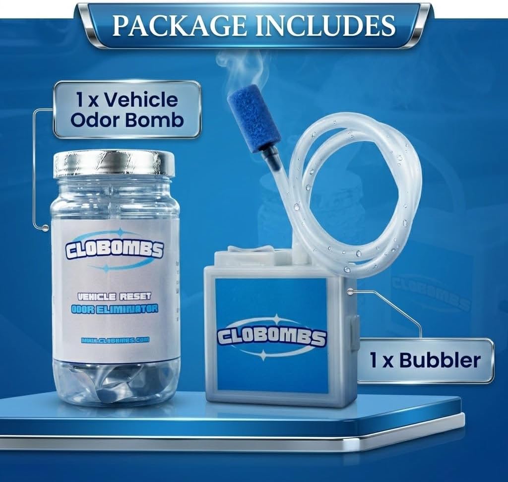 CloBombsCar Smoke Odor Eliminator is the ultimate solution for removing stubborn smells from cars, RVs, and boats. Utilizing scientifically proven chlorine dioxide technology, this kit doesn't mask unpleasant scents; smoke odor eliminator for car destroys them at the molecular level. Whether battling heavy cigarette smoke, cat urine, spoiled food, or mildew, our smoke smell eliminator for carpenetrates deep into upholstery and HVAC systems. For extremely long-term odors, an extra bomb may be necessary.Key FeaturesAdvanced Formula: Chlorine Dioxide odor eliminator neutralizes complex molecules permanently.Included Bubbler: Actively bubbles water to maximize efficiency.Jar Instructions: Easy-to-read directions are printed directly on the bottle.Fast-Acting: Delivers a complete interior reset in just 60 minutes.BenefitsRestores vehicle value by permanently removing foul odors.Saves time and money compared to expensive detailing services.Easy water activation requires no special equipment.What's in the Package1Chlorine Dioxide Car Odor Eliminator1 Activation Jar1 BubblerNote: Post-treatment chlorine scent dissipates quickly with AC. Keep away from open flames during use..