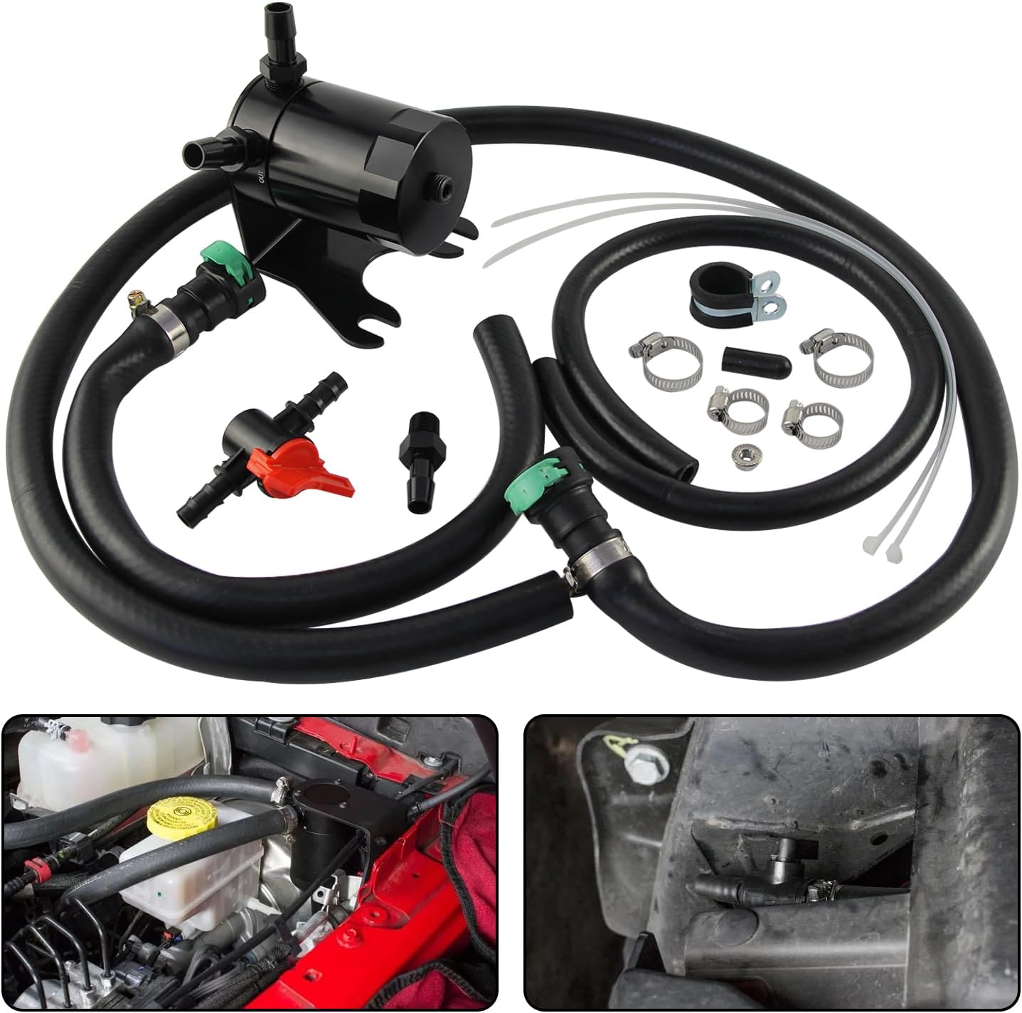 APPLICATION: For 2018-2023 Jeep Wrangler JL w/ 3.6L Pentastar V6 For 2020-2023 Jeep Gladiator JT w/ 3.6L Pentastar V6 Note* Vehicles with Mopar part number 82215190 Auxiliary Switch Bank may require relocation of the auxiliary relay box from above the brake booster to use this catch can. DESCRIPTION: Direct fit for the 2018+ Jeep Wrangler JL 3.6L**See note Below** Included drain kit empties catch can in minutes through the fender well for easy, mess-free maintenance without opening the hood Durable 2.5mm thick steel bracket mounts the catch can out of the way of other engine components and isolates it from engine vibration for a lifetime of service Helps maintain proper octane levels to reduce potential detonation Defends intake system and essential engine components from oil blow-by Includes direct-fit hoses with pre-installed quick-disconnect fittings for quick and easy installation 3 oz. capacity for longer service intervals CNC-machined aluminum barbed fittings create a secure connection between lines and the can Note: After installation, We recommends checking the contents of the baffled catch cans every 1,000 miles until a baseline is established. Oil blow-by accumulation will vary with ambient temperatures and driving conditions. It is important that the contents of the can do not rise above the internal baffle.