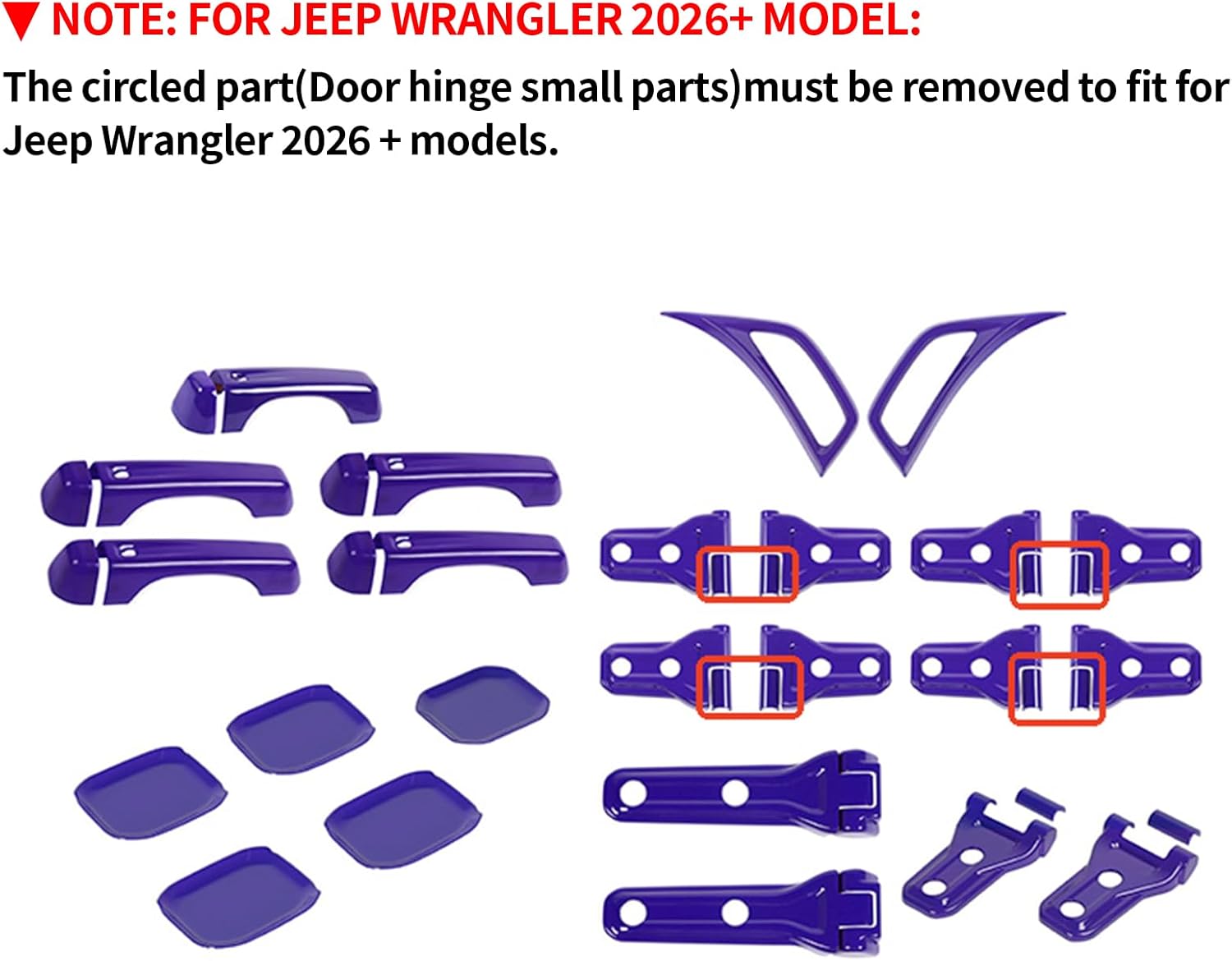 | Included Components | 2* Wheel Eyebrow Side vent covers, 2*Tailgate Hinge Covers, 2*Hood Hinge Covers, 4* Door Handle Vovers, 1* Tailgate Handle Cover, 4* Door Handle Inserts, 1*Tailgate Handle Inserts, 8*Door Hinge Covers |