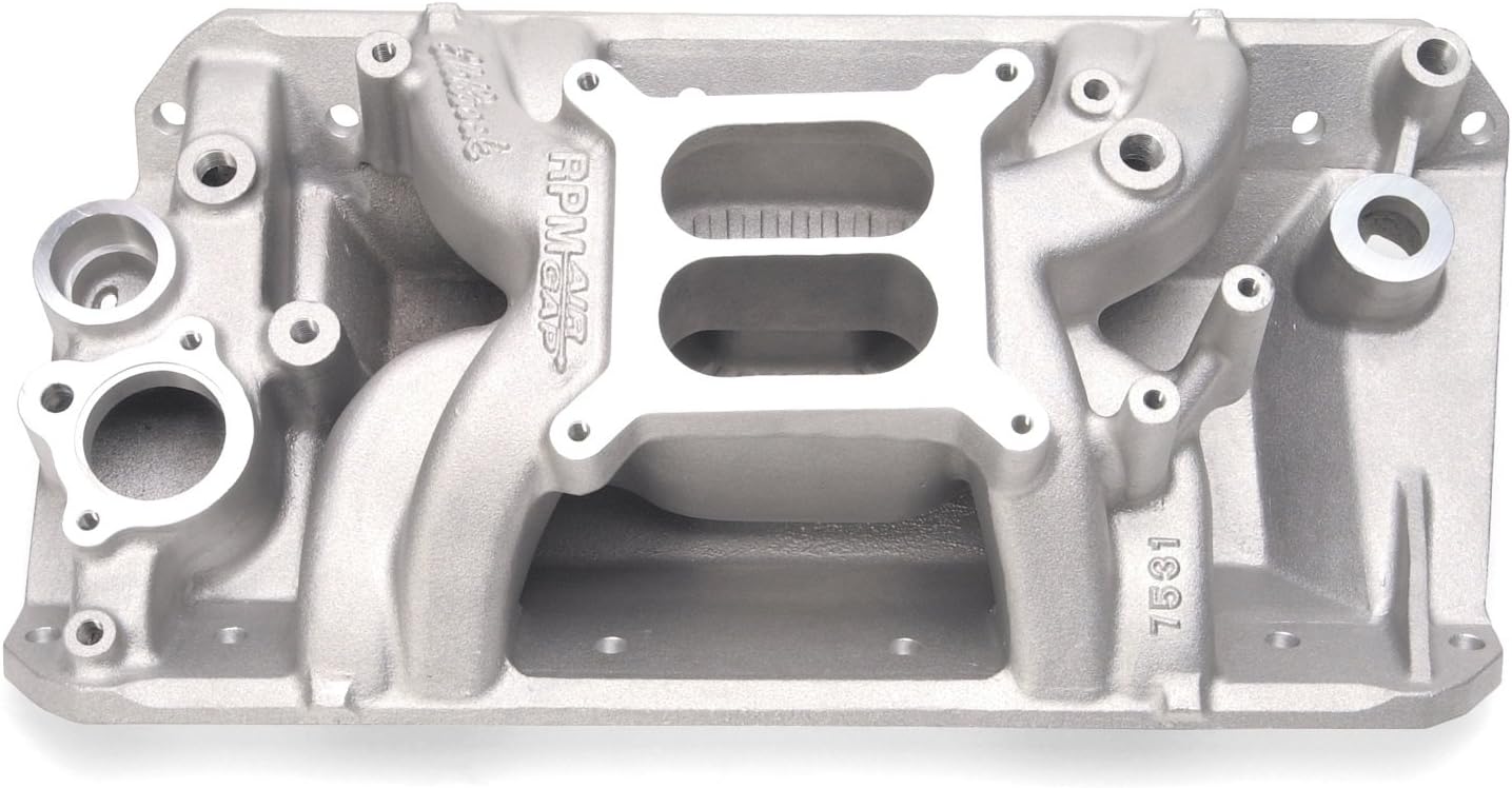 The Edelbrock Performer RPM Air-Gap Intake Manifold incorporates race-winning technology. The air-gap design features an open air space that separates the runners from the hot engine oil resulting in a cooler, denser charge for more power. It includes standard oil fill and PCV, as well as early air conditioning support bracket accessory bosses. It has no provision for exhaust heated chokes and no exhaust crossover. The aftermarket 4-bbl carburetors are not compatible with Auto Overdrive Transmission (AOD).