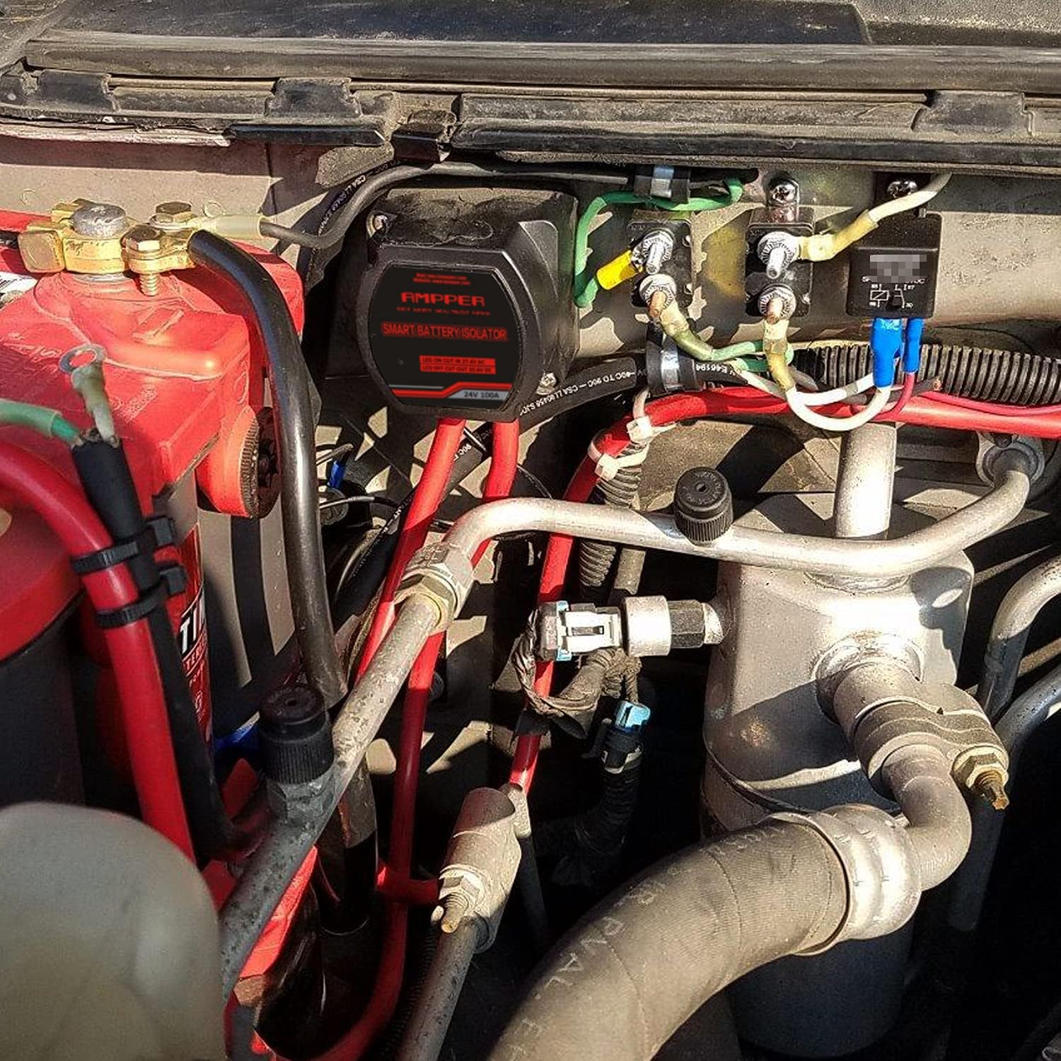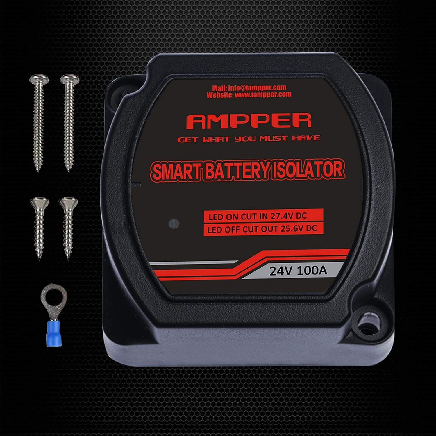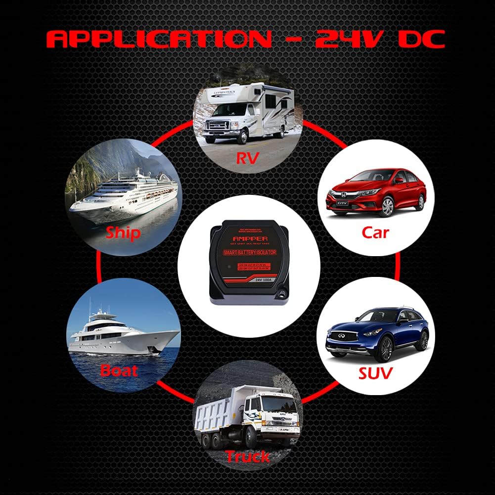Ampper 24V battery voltage sensitive Relay (VSR) dual battery isolator kit for car, vehicle, RV, ATV, UTV and boat. Specifications: 1, Design for two battery systems isolate and charge, it's all need to charge and isolate two batteries (SUITABLE for Acid-Lead batteries, NOT SUITABLE for Lithium batteries). 2, Allow to having two separate power sources while charging by one alternator. 3, Cuts in at 27.4 volts and cuts out at 25.6 volts. 4, Ensure your primary battery is always charged and ready to start your engine, the secondary will be charged after the primary battery's volts exceed 27.4 volts. 5, Heavy built to suitable for almost anywhere even off-road, which is water resistant, shock resistant, dust proof and withstand unexpected extreme weather environments. 6, Universal used for car, vehicle, RV, ATV, UTV and boat, also two battery electrical equipment. 7, VSR kit comes with all the pieces needed (battery cables, battery terminals, copper lugs, heat shrinks, cable ties) for a complete installation. Complete kits includes: 1 x voltage sensitive Relay (VSR). Red and black battery cables. 3 x battery terminals. 3 x copper lugs. heat shrinks. cable ties. 4 x bolts for install.