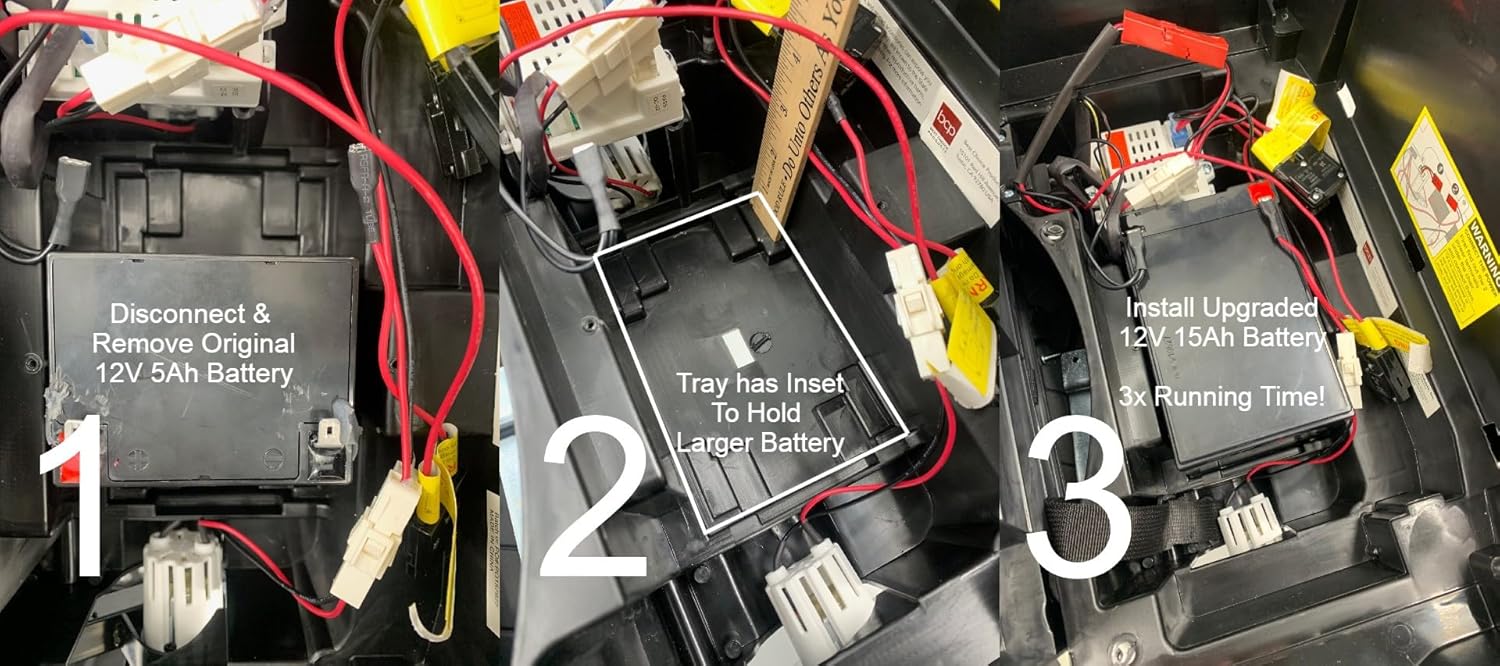 Best Choice Upgrade! The Impact Battery 12V 15Ah replacement provides 3x the run-time compared with the tiny Best Choice Products (BCP) 12V 4.5Ah battery (6FM4.5). The BCP battery tray has an inset that can accomodate the larger 15 amp hour battery providing a 300% longer play time before needing to be charged again.