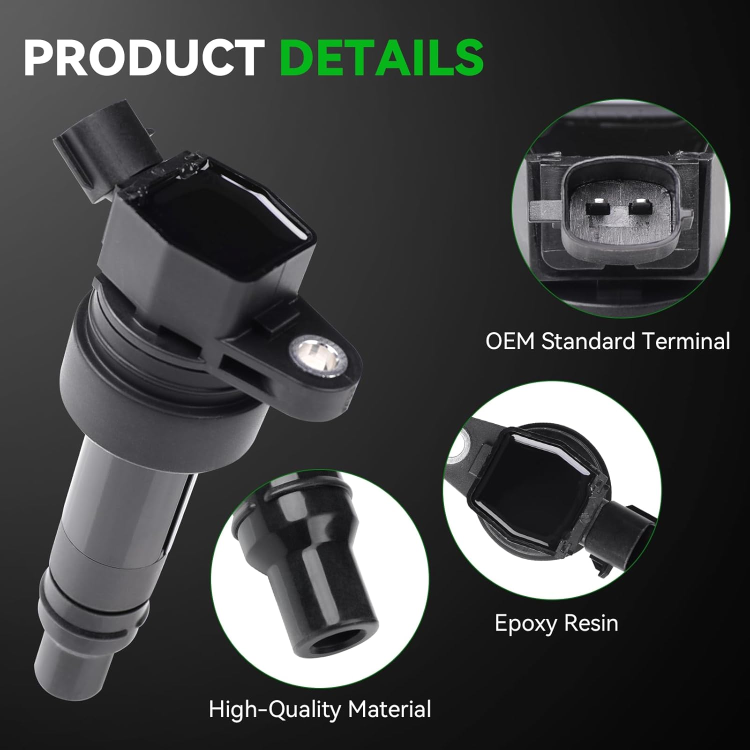 Maximize your engine's potential with our high-performance ignition coils. They deliver quicker ignition, increased power, and reduced vibration for a smoother drive. Engineered for efficiency, they help lower fuel consumption and are built with heat-resistant materials for enhanced durability and a longer lifespan. Package Includes: 4 x Ignition Coils Replacement OE Numbers: UF-707, GN10683, 27301-2B110, 273012B110 Compatible with Hyundai Models: 2013-2015 Veloster L4 1.6L (Turbocharged) Compatible with Kia Models: 2014-2015 Forte Koup L4 1.6L 2014-2015 Forte5 L4 1.6L