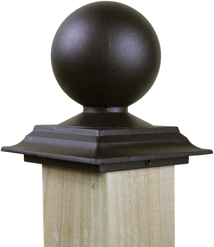 These decorative post caps are designed to mount on top of 4x4 fence posts and includes (2) mounting screws for wood. Housing is constructed with powder coated cast aluminum so they will not rust and are scratch resistant. These post caps protect the top of existing or new posts, adding many years of life to your fence and value to your home. Outlasts any wood product on the market. These post caps fit standard 4x4 (3-1/2" x 3-1/2"up to 4" x 4") posts. Overall size: H 6" x W 5.5" x D 5.5".