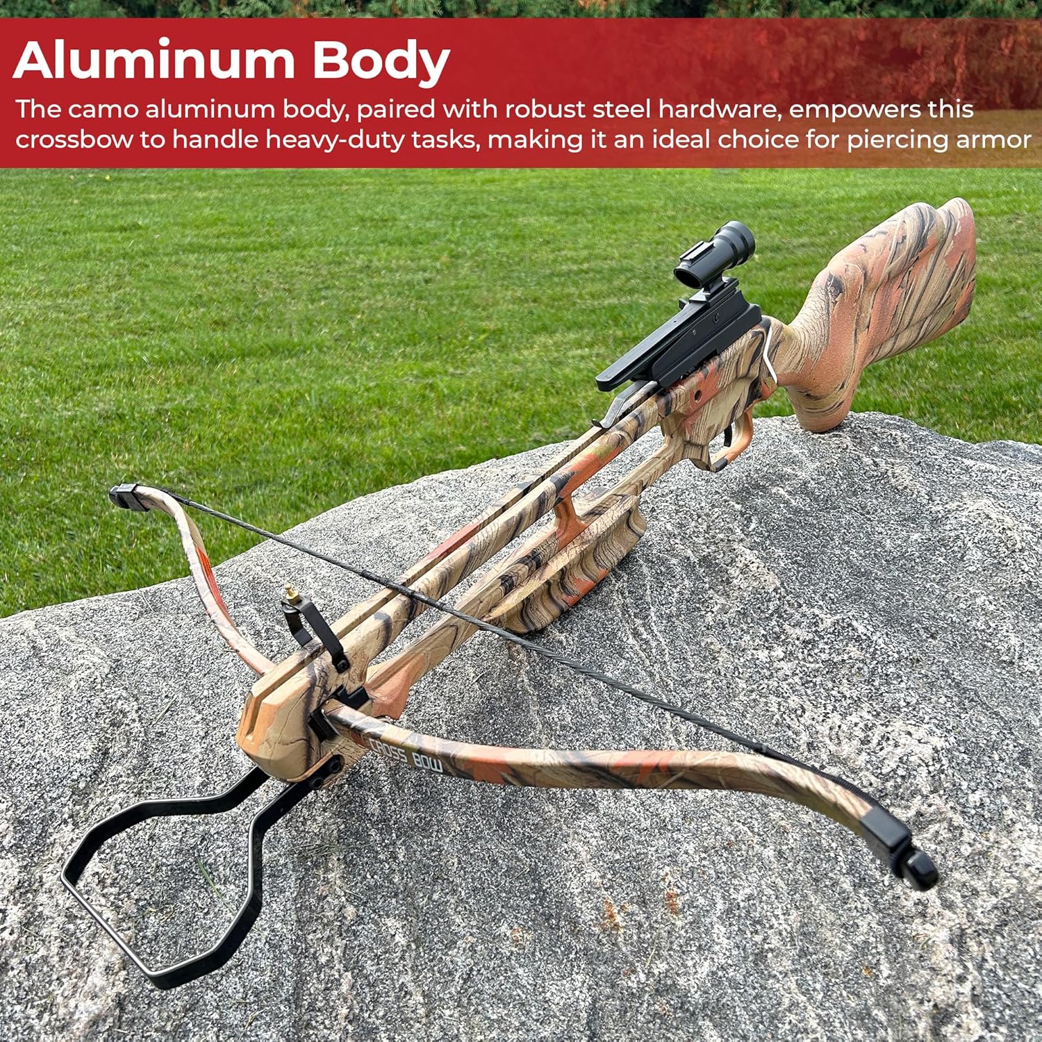 Unleash precision and power with our Stealth Striker Hunting Pre-Strung Autumn Camo 150 LBS Crossbow. This high-performance crossbow fires at an impressive speed of 210 feet per second, effortlessly piercing large or thick targets with unmatched ease. The camo aluminum body, paired with robust steel hardware, empowers this crossbow to handle heavy-duty tasks, making it an ideal choice for piercing armor. The wooden fiberglass compound stock provides a superior hold and stability during firing, ensuring accuracy and control. With the convenience of being pre-strung, this crossbow eliminates the hassle of stringing, allowing you to focus on your target. Equipped with adjustable rear and front sights, achieving 100% accuracy is effortless. The foot stirrup makes cocking back a breeze, while the quick-loading 16-inch aluminum bolt arrows deliver swift and precise shots. For added convenience, a tool kit and arrow starter set are included with the crossbow.