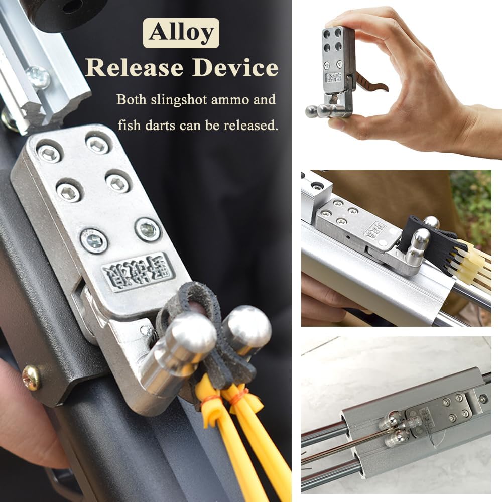 Package A: 8-hole slingshot head*1, release*1, 8-strand rubber band*1,Accessory Base *1 Package B: 10-hole slingshot head *1, release *1, 10 strands of rubber bands *1,Accessory Base *1 Package A comes with a catapult slingshot head that has 8 holes and can be fitted with 8 strands of tubular rubber bands, and Package B, which also has 10 holes, comes with a 10-strand rubber band accordingly. The number of holes affects the speed, accuracy and stability of the projectile or arrow when shooting. The mechanical slingshot head is made of stainless steel with screw holes as well as screws for easy mounting. The protruding part next to the stainless steel slingshot head is convenient for you to step on the rubber band when stretching it, thus helping to hold the high velocity slingshot in place in order to provide extra support and stability, preventing it from wobbling, and helping to make the shooting smoother. The release ensures that the ammo remains stable when shot, reducing the likelihood of jitter, off-target shots in flight. The simple design and ease of operation of the release allows you to quickly prepare and shoot the ammo without having to pull the trigger before using it, simply clip the pouches with the ammo on it and then pull the trigger to release it. Not only can it be used to shoot slingshot ammo, it can also shoot fish darts for fish shooting activities. The accessory base allows you to install accessories such as flashlights or aiming lights according to your personal needs, just with a clip to install. Caution: 1. For a 10-hole slingshot head it is recommended to use a rod with a diameter of about 25mm. 2. The release device will not open the steel post after pulling the trigger without clamp the ammo.