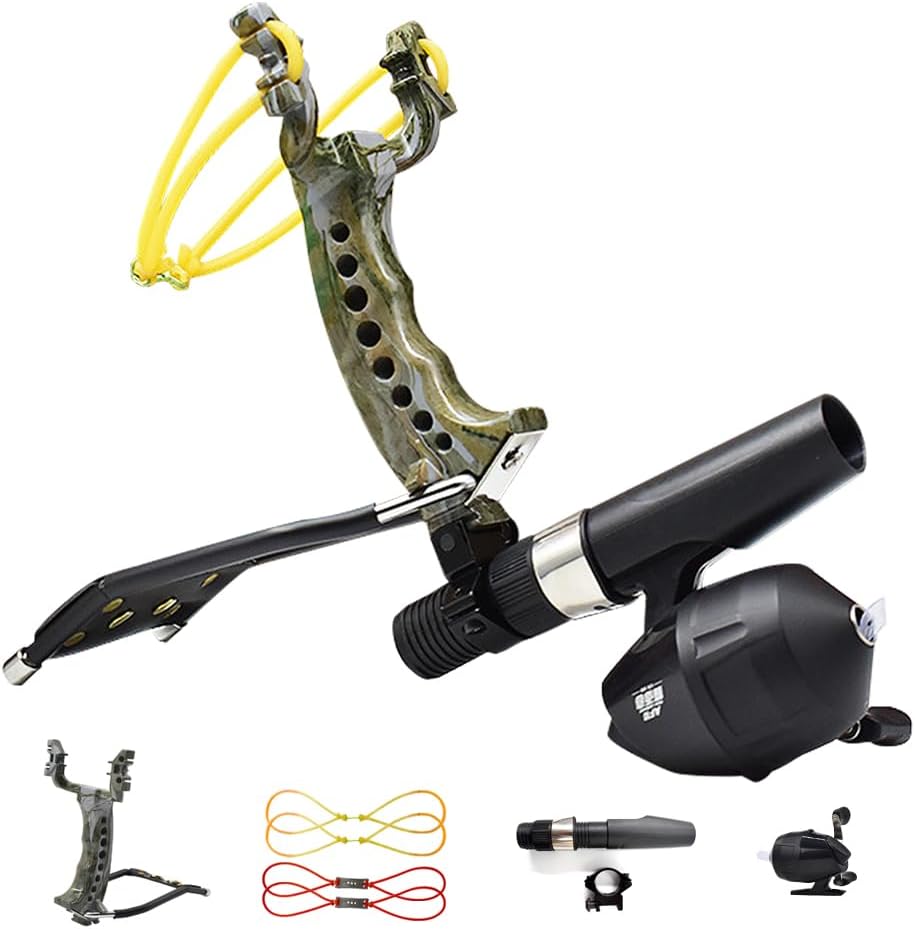 Specification: Size: 3.7×7.5inch (9.5×19cm) Weight: 13.3oz (378g) Material: Alloy Package: Package A includes slingshot*1, rubber band *3 Package B includes slingshot *1, fish shooting rubber band *3 Package C includes slingshot*1, rubber band with leather pocket*2, fish shooting rubber band*2, fishing reel accessories*1 Runzkzy wrist Rocket Slingshot has a camouflage look, alloy material, leather wrist rest, and magnetic attachment design, making it more sturdy and durable as well as easy to use. The tube-mountable sling shot can be used with rubber bands with pouch or fish shooting bands for a variety of different scenarios. When using a rubber band with pouch, you can attach the steel ball ammo to the magnetic wrist rest for easy changing of ammo after shooting, which is an ingenious design that makes it easier to use. The handle of the tactical slingshot is ergonomically designed, slightly curved and grooved to fit the palm of your hand more comfortably, and the foldable wrist rest increases the stability of the slingshot when using it, allowing you to fire the ammo more steadily when aiming at the target. This survival slingshot can not only use rubber bands with pockets to fire ammo, but can also be replaced with fish shooting bands and fish darts with fishing wheels to shoot fish, the bottom of the fishing slingshot can be mounted on the bottom of the clip used to install the fishing wheel accessories and so on. The multifunctional slingshot can also be used to drive away the annoying animals that intrude into your home or as a gift for your family and friends, and it can also be used for shooting practice and reminiscence of childhood. Note: 1. please make sure the size meets your requirements. 2. Please check the condition of the leash before use, do not continue to use it after wear and tear.