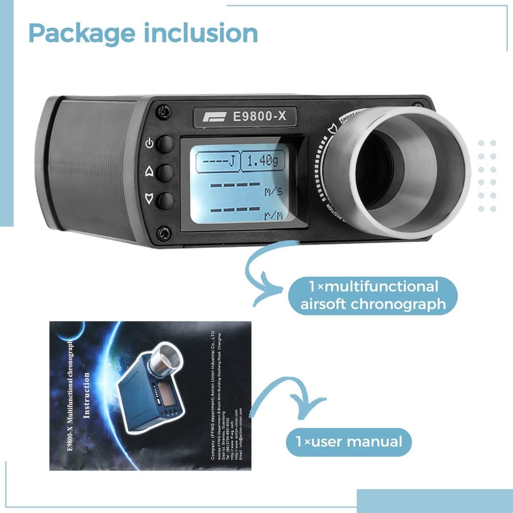 Color: black Material: ABS Size: 5.12 times;3.74 times;1.77in Package Includes: 1 times;multifunctional airsoft chronograph, 1 times;user manual Note: - Please refer to the measurement. Tiny measuring error is allowable in normal range. - There might be a little color difference due to the monitor, camera or other factors, please refer to the physical item.
