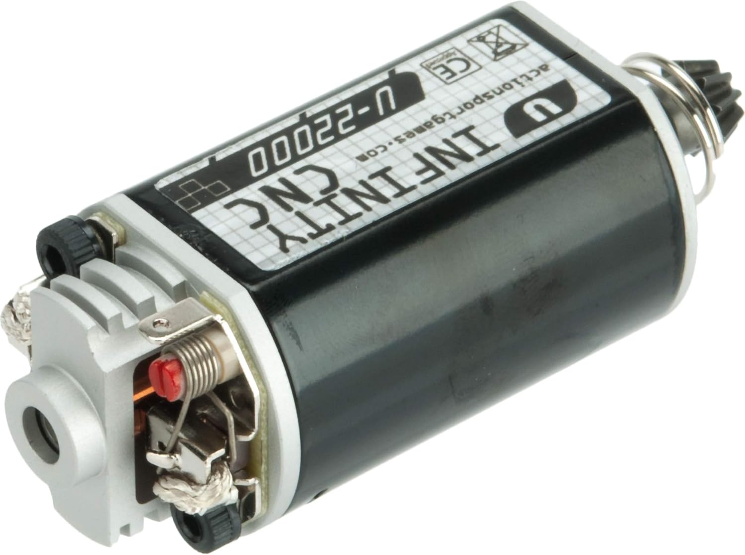 This is a long shaft version, rated to run at 22000 rpm. The latest high-performance motors in the ULTIMATE Upgrade Series are made with CNC machined parts for greater strength and performance, and have all been developed to include the latest technologically developments, in a continuing effort to offer a wider selection of motors allowing the discerning Airsoft player to find the optimal solution for any particular component. The INFINITY CNC motors are designed, with the best features found in Airsoft motors currently on the market. The result is a motor which is at the pinnacle of what is achievable today. Material: CNC machined aerospace grade aluminum, CNC machined chromoly Turns Per Armature: 22T Armature Wire size: 0.7mm Type: Short Application: High Torque