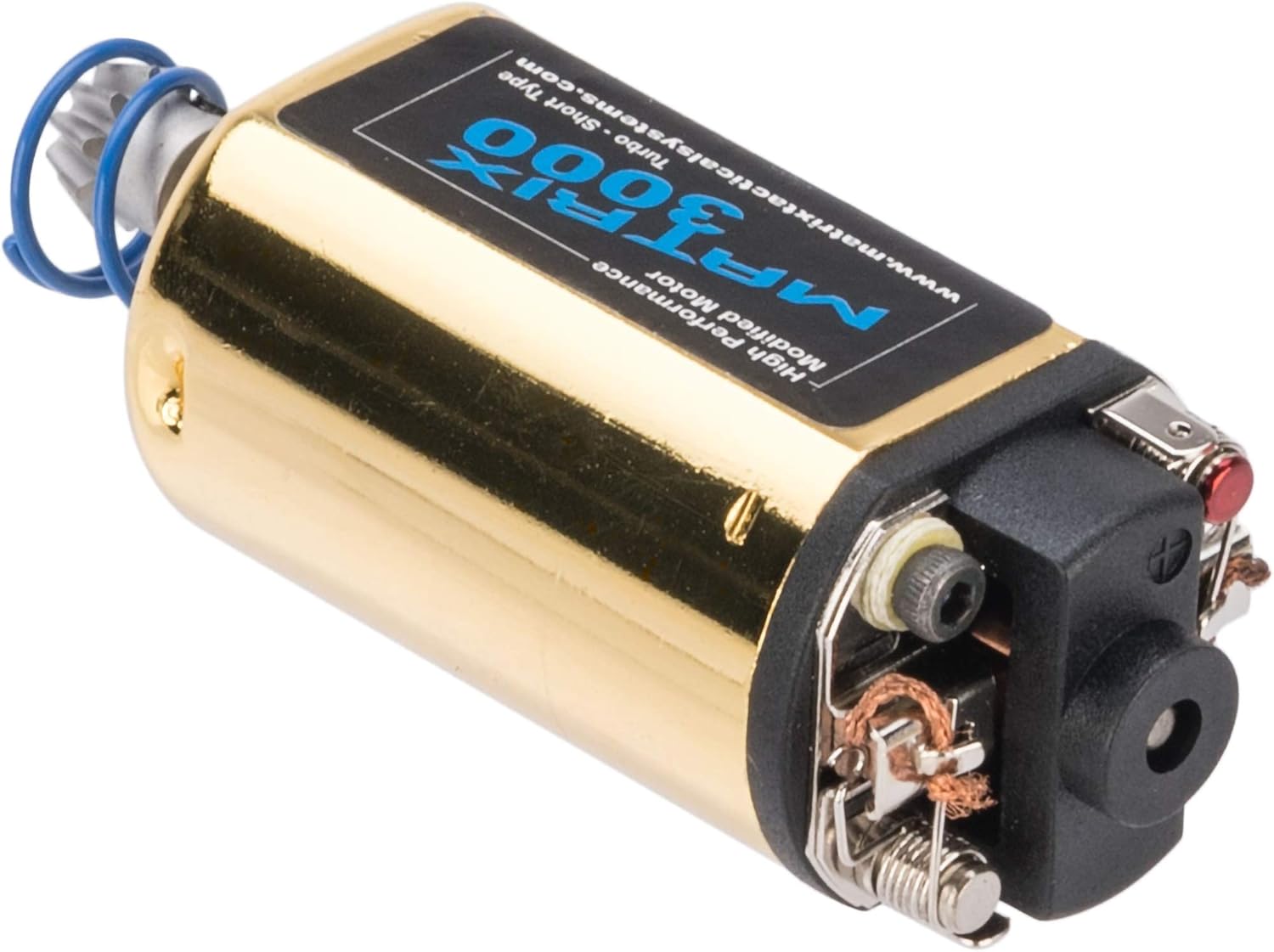 The Matrix Turbo Series motor is a well designed, balanced internal component. Matrix engineered this motor to the highest specs while incorporating both weight and energy saving components to produce an overall very well balanced, high-performance high speed motor. The Matrix motor is made with CNC military grade aluminum, anodized shaft with integrated bearing, silver brushes, High Strength Neodymium Magnets, and a strong steel outer Airsoft Shell. Time to replace that old, tired original motor your AEG came with. Turns Per Armature: 12TPA Motor Type: Short Type Application: High Speed Compatibility: For AEG Airsofts that utilize a long-type motor. Compatible with Tokyo Marui, G&P, WE, Classic Army, VFC, KWA, G&G and other compatible M4-Style series AEG Airsoft Materials: CNC Aluminum, Steel, Carbon, Copper, Silver