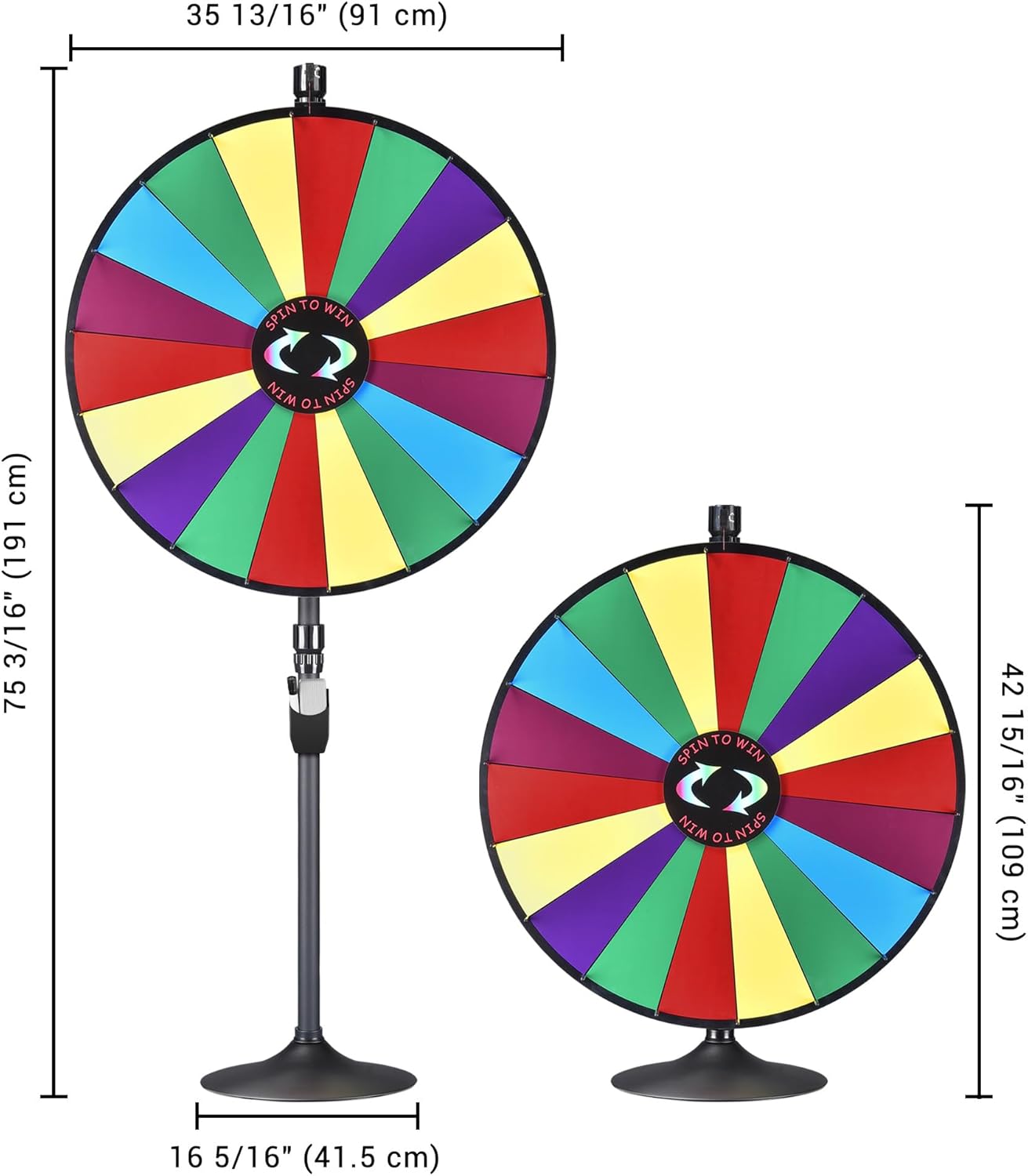 Specifications:- Floor Stand Overall Dimension(LxWxH): 35 13/16" x 16 5/16" x 75 3/16" (91 x 41.5 x 191 cm)- Tabletop Overall Dimension(LxWxH): 35 13/16" x 16 5/16" x 42 15/16" (91 x 41.5 x 109 cm)- Wheel Diameter: 35 13/16" (91 cm)- Upper Pole Size(HxDia.): 41 5/16" x 1 11/16" (105 x 4.3 cm)- Bottom Pole Size(HxDia.): 37" x 1 11/16" (94 x 4.3 cm)- Base Size(HxDia.): 16 5/16" x 3 3/8" (41.5 x 8.5 cm)- Center Plate Diameter: 8 11/16" (22 cm)- Material: U-PVC Foam Board with Acrylic Sheet- Net Weight: 24.3 Lbs (11 kg)Package Contents:- 1x Prize Wheel- 1x Center Plate- 1x Base- 2x Poles- 1x Holder- 1x Eraser- 1x Water-based Mark Pen- 1x Allen Key- 1 Set of Accessories- 1x Manual
