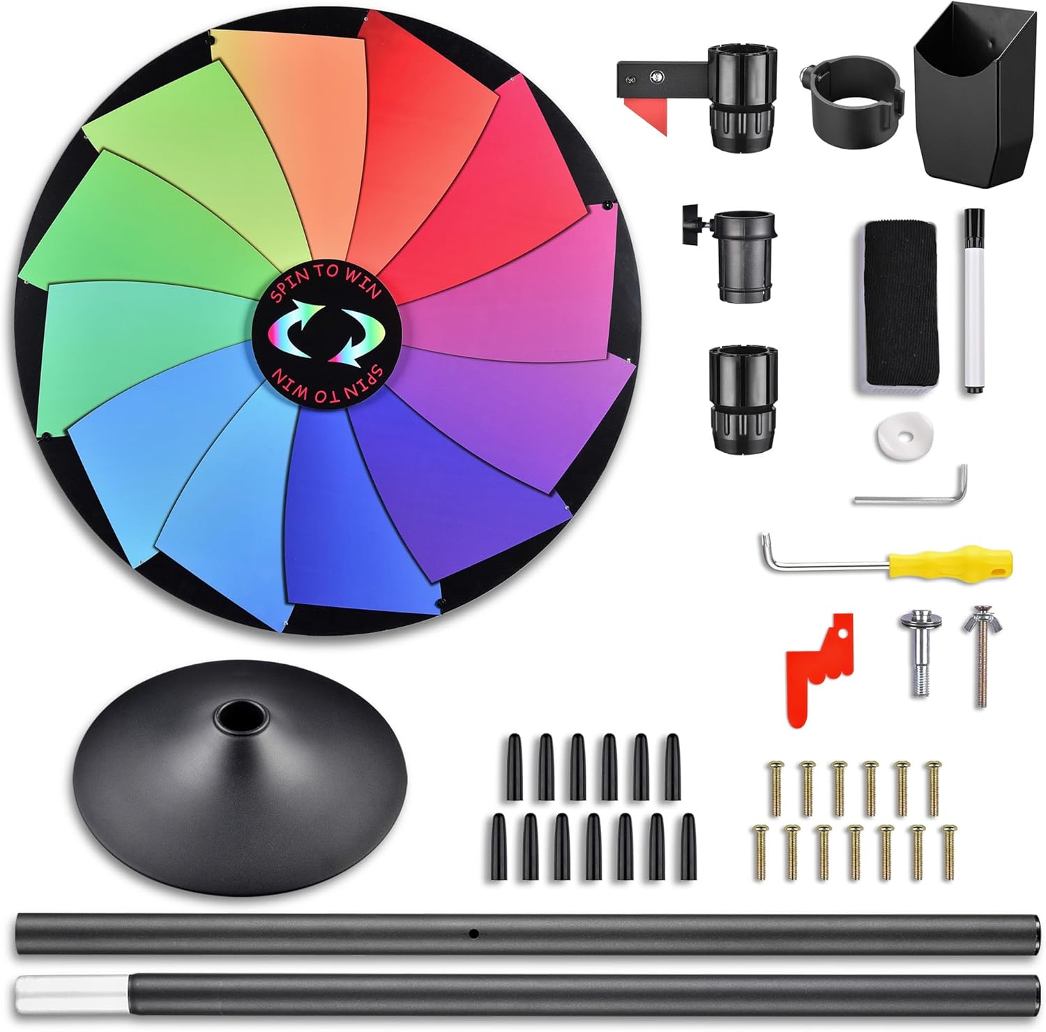 Features:- Dual-Mounting Installation - Features dual-purpose mounting and installation, allowing both tabletop or floor standing use by simply connecting 1 pole to the base for tabletop use, or connecting 2 poles to the base for floor standing use- Attention-Grabbing - Designed with a windmill-patterned template, it creates an attractive appearance of stereoscopic effect, while also producing an attention-grabbing clicking sound while spinning, helping you draw large crowds at tradeshows, carnivals, events, parties, markets, etc.- Smooth Spinning - Features an upgraded roller and plain bearing system for smooth spinning, reducing wear-and-tear and lengthening its service life while enabling longer spins which enables enhanced suspense- Customizable & Editable - Features rewritable acrylic writing board with 12 slots for easy customization of various games, and editing different prize rewards, giving you the creative freedom to come up with an endless number of potential games to be played; Comes with a detachable pen holder for storing marker and eraser- Durable & Portable - Featuring a sturdy metal base and aluminum alloy pole for durability and resistance to rust, corrosion and wear-and-tear, it also designed to be easily detachable and separable for easy space-saving storage and portability to various event venuesSpecifications:- Floor Stand Overall Dimension(LxWxH): 35 13/16" x 16 5/16" x 75 3/16"- Tabletop Overall Dimension(LxWxH): 35 13/16" x 16 5/16" x 42 15/16"- Wheel Dia.: 35 13/16"- Center Plate Dia.: 8 11/16"- Upper Pole Size(LxDia.): 41 5/16" x 1 11/16"- Bottom Pole Size(LxDia.): 37" x 1 11/16"- Base Size(Dia.xH): 16 5/16" x 3 3/8"- Net Weight: 24.3 LbsPackage Contents:- 1x Prize Wheel- 1x Center Plate- 1x Base- 2x Poles- 1x Eraser- 1x Water-based Mark Pen- 1x Allen Key- 1x Pen Holder & Set of Accessories- 1x Manual