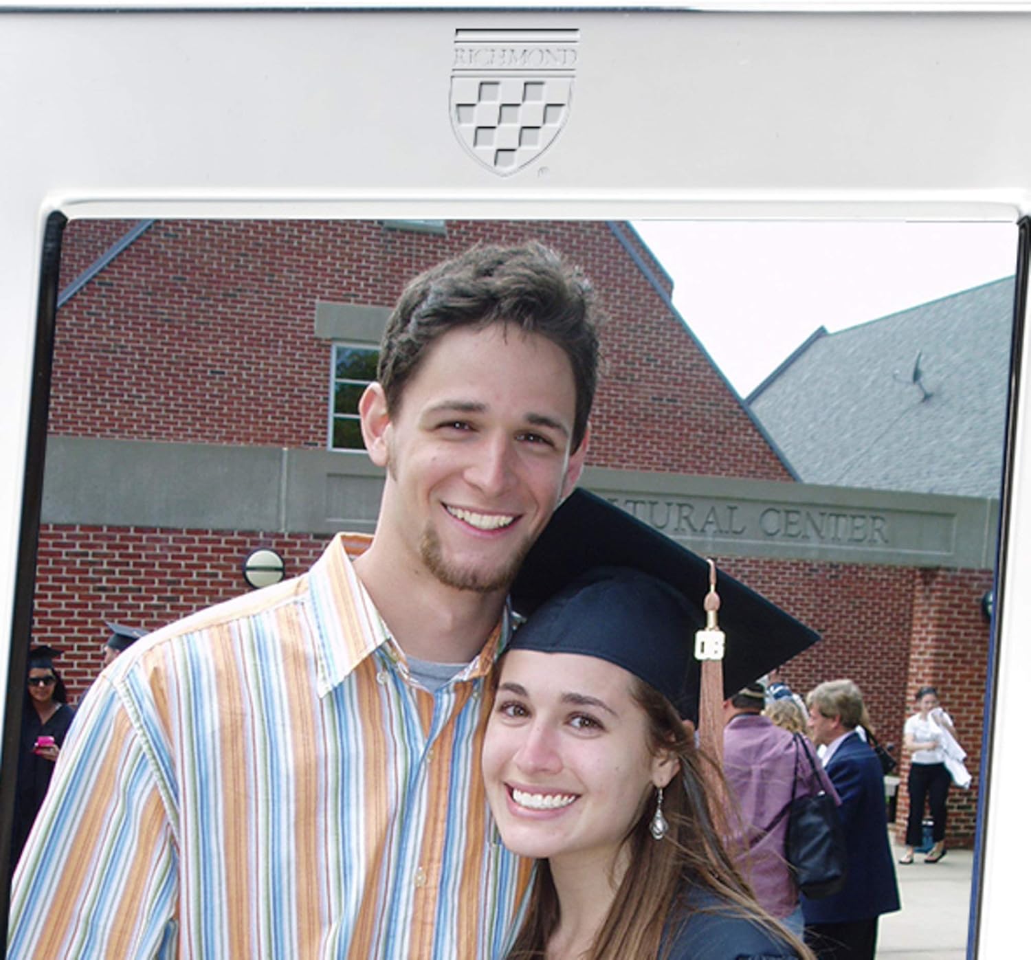 Handsomely engraved University of Richmond pewter frame, generously accommodates your custom-engraved personal message. Officially licensed by University of Richmond Sized for 5" x 7" photo, portrait or landscape orientation (select below). Easel back. Crafted from solid pewter with high-polish finish. Presented in our attractive gift box. Combine with our pewter julep cup or other desk accessory for a unique gift set.