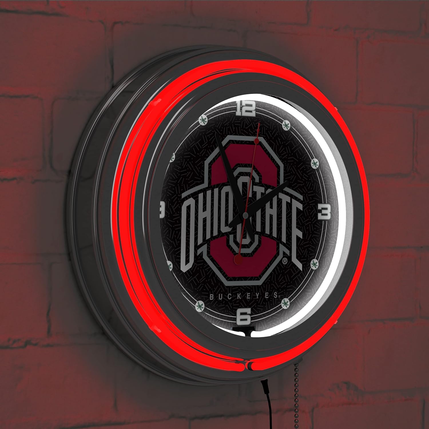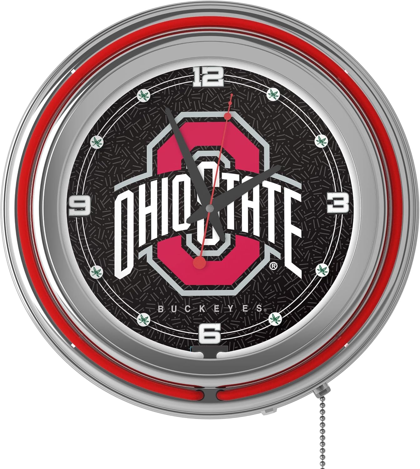 The officially licensed Ohio State University Clocks are the perfect addition to any game room, garage, or man cave. Featuring an accent-colored outer neon ring and an interior white neon ring, this cool clock comes equipped with a pull chain for controlling the two different light modes: solid and blinking. The battery-operated analog clock mechanism will keep it ticking for a long time, while the neon runs off the included AC adapter to light up your favorite logo. The 3-inch depth of the wall clocks vintage combined with the radiant shimmer of the neon reflecting off the chrome-finished resin housing is sure to make this light up clock pop on any wall. IMPORTANT: Trademark Gameroom is committed to providing the consumer with the absolute best price and value on all of our products. NOTE: This is an exclusive product of Trademark Gameroom and ONLY Wall Clocks Battery Operated by Trademark Gameroom are GUARANTEED to be genuine. Avoid buying counterfeit products and transacting with unauthorized sellers. Trademark Gameroom is a registered trademark protected by U.S. Trademark law and will be vigorously defended.