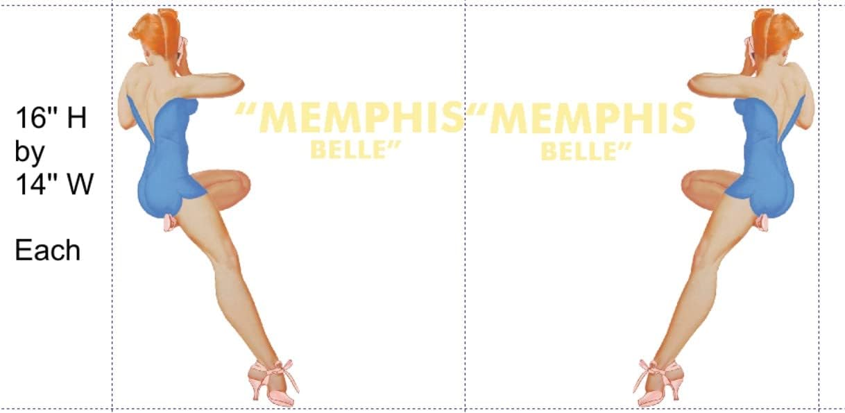 Memphis Belle Left and Right Peel and Stick Vinyl Decal on one sheet Dimensions: Girl is 15.5"height X 7.5"width Lettering is 2.5"height X 9"width 3M permanent: This is a permanent adhesive that can be placed outdoors on windows or surfaces. It is more difficult to remove than low tack. Please be advised that all vinyl should be applied to a clean surface that is at least 50 degrees Fahrenheit / 10 degrees Celsius for 24 hours for best adhesion. Ink is health and environment safe Performance No special ventilation is required with HP Latex Inks. HP Latex Inks have no hazard warning labels, contain no Hazardous Air Pollutants (HAPs), are non-flammable and non-combustible, and are nickel-free. HP Latex Inks allow print service providers to produce odorless prints for indoor display in sensitive environments such as hospitality and healthcare. Certifications HP Latex Inks have qualified for certifications that demonstrate they meet some of the world's most rigorous and comprehensive standards for low chemical emissions into indoor air.