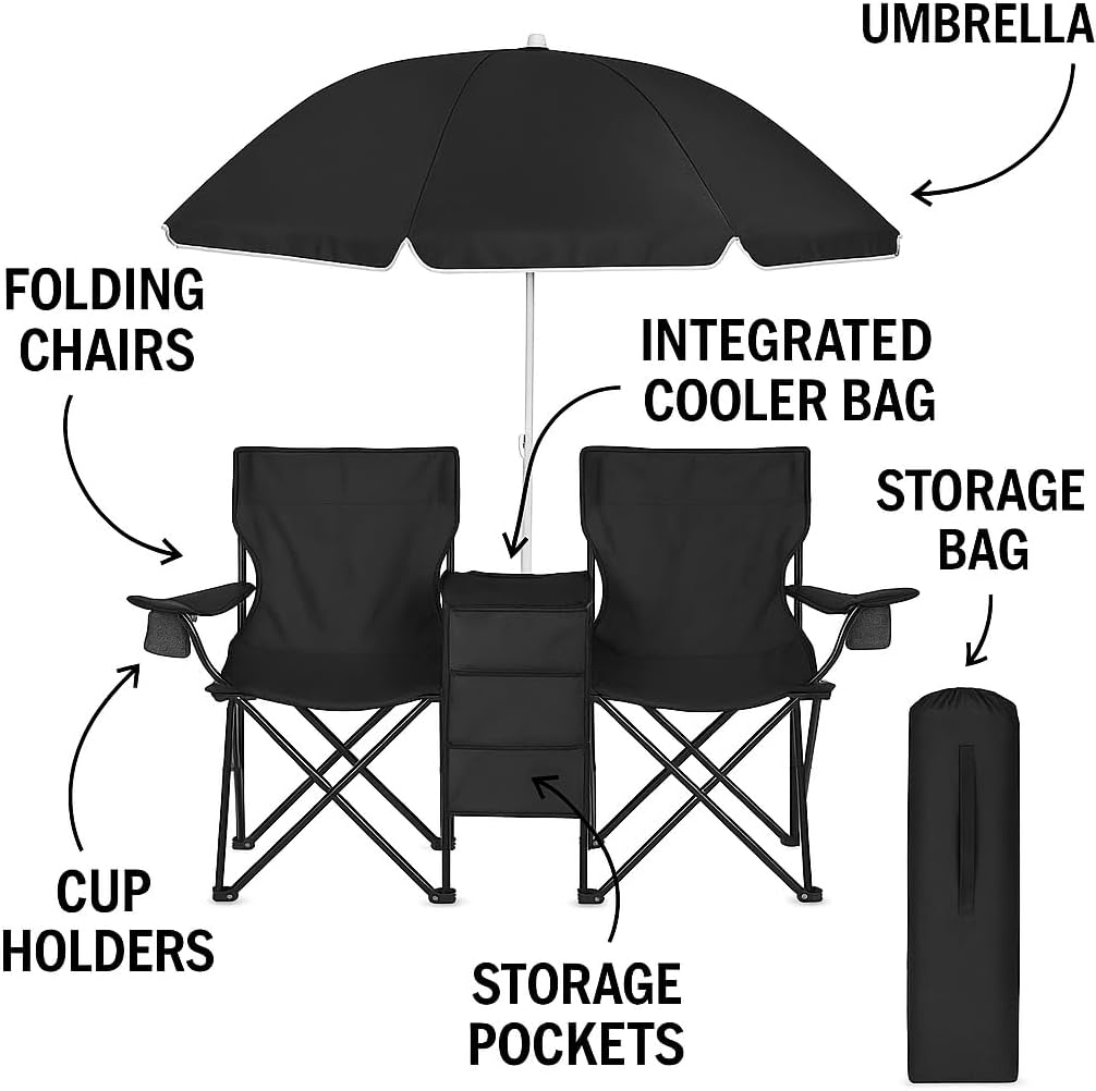 Upgrade your outdoor adventures with this Portable Double Folding Chair Set. Designed for comfort and convenience, it features two connected chairs, a built-in insulated cooler, mesh cup holders, and a removable umbrella to keep you shaded. Whether you're tailgating, camping, or enjoying a day at the beach, this all-in-one seating solution ensures you'll always have a cool drink in hand and relief from the sun. The durable frame folds down easily and fits into the included carry bag for grab-and-go portability. Perfect for taking to the stadium for tailgating, the beach, camping, kids' soccer games, or anywhere else where you want to relax. Each Double Folding Chair folds down to a compact size and fits into an included matching carrying case for easy transporting. Weighing in at around 13 pounds, the Double Folding Chair features a center armrest that doubles as a cooler for storing your ice-cold beverages. Also includes a detachable umbrella to keep you shaded on those hot summer days. Measures 60 in x 33.5 in x 21 in. Umbrella measures 54 inches in diameter. Built on a tubular steel frame and made of 600D coated nylon.