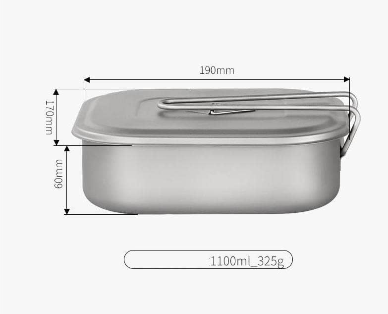 Suitable for family gatherings, outdoor gatherings, cycling, mountain climbing, self-driving, camping, fishing, outdoor barbecues and other outdoor sports Pure Titanium Lunch Box 1000ML Outdoor Portable Square Lunch Box Made of high-quality titanium alloy, high temperature resistance, strong and wear-resistant, strong bearing capacity The bowl body is integrally formed, not easy to break, not easy to deform, seamless connection, more clean Not easy to stick, not easy to leave marks, easy to clean The corners are smooth, no burrs, no scratches Designed with a cover to prevent dust from entering; it can be used for short-term heat preservation; the cover can also be used as a plate The cover has a handle for easy access and prevents hot hands With a hollow folding handle, it is comfortable to hold and prevents hot hands; the handle is connected and fixed, with strong bearing capacity, and does not shake when used; it can be folded and hung for storage, saving storage space 1100ML super large capacity, fully meet the needs of outdoor multi-person use The contact surface at the bottom of the bowl is flat and does not tilt when placed Lightweight design, more convenient to carry outdoors