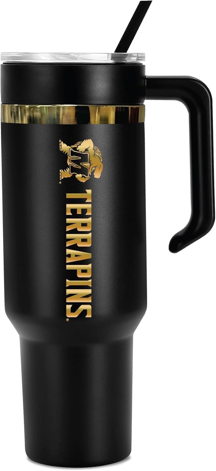 Satisfy your thirst and show off your school pride with the Anodized Tumbler, designed for bold style and everyday performance. Featuring double-wall stainless steel construction with copper lining and vacuum insulation, this tumbler keeps drinks cold and refreshing for hours. Designed for versatility, the secure screw-on lid allows the tumbler to be used with or without the removable top handle, while the slim, cupholder-friendly base makes it easy to take on the go. A color-coordinated flexible silicone straw adds both comfort and style.
