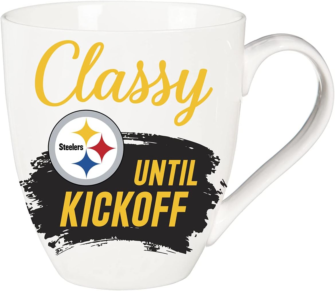 Measures approximately 5.87 x 4.75 inches. This Ceramic Cup O'Java is microwave and top rack dishwasher safe. Comes with a matching gift box. Enjoy a hot coffee or refreshing beverage with these mugs that holds up to 17 oz. Its circular-shaped handle helps you enjoy your morning coffee or hot tea comfortably while supporting your favorite NFL team. Features the official Pittsburgh Steelers logo and colors. These mugs have a sleek design and also include playful text to get you ready for gameday. Reads: "This is what an Awesome Fan Looks Like" and "Classy until Kickoff." Perfect gift for a friend or family member who is a fan of the Pittsburgh Steelers. Evergreen Sports offers nothing but officially licensed college and professional sports league products. We pride ourselves on unique and eye catching designs for every item. Our products make the perfect gift for any occasion for family and friends or yourself! Evergreen Sports features NFL, NHL, MLB & NCAA licensed products. We carry items for every fan shop with tons of high-quality sports merchandise for NFL, NHL, MLB and NCAA teams. We are proud to bring tailgating and gift-giving items any fan could appreciate. Click on the Evergreen Sports Link under product name to shop our full catalog.