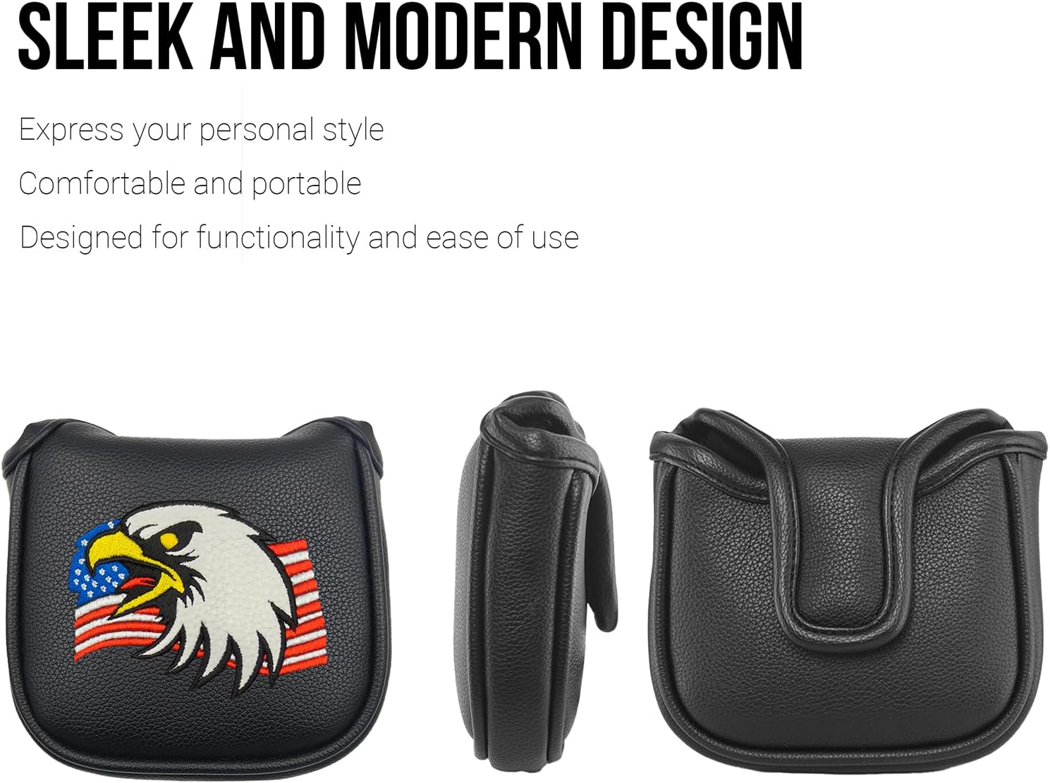 Show your patriotic pride on the golf course with this bold mallet putter head cover featuring a striking embroidered bald eagle and American flag design. Crafted from durable synthetic leather, this square-style mallet putter cover offers reliable protection for your club head while making a statement every time you pull it from your bag. The vibrant, detailed embroidery showcases a fierce bald eagle set against the red, white, and blue of the American flag, making it a standout accessory for any golf enthusiast. The pull-on closure ensures a secure fit, keeping your putter safe from scratches and dings during transport and storage. Measuring approximately 8 inches in length and 4 inches in width, this cover is designed to fit most standard square mallet putters. Whether you're hitting the links on a weekend round or gifting it to a fellow golf lover, this patriotic putter cover is a fantastic choice. Backed by a 1-year warranty for added peace of mind.