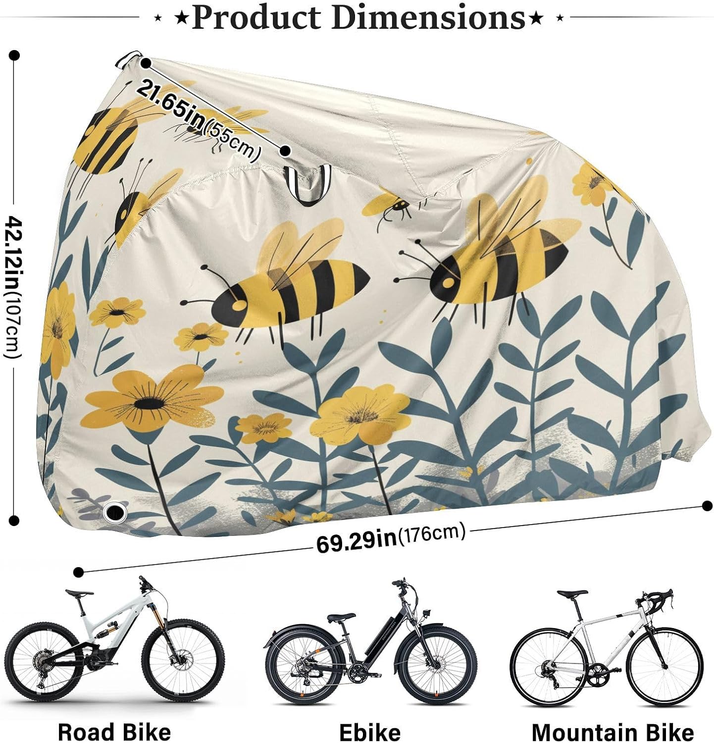 Protect your bicycle in style with our premium bike tarp, engineered for maximum defense against harsh elements. Unlike basic covers, we use specially engineered umbrella waterproof fabric - the same advanced material used in high-end rain umbrellas - delivering superior performance with unique visual appeal. Sun & Heat Defense Our fabric creates a physical cooling barrier that actively lowers your bike's temperature by: Blocking 95%+ harmful UV rays to prevent paint fading Providing exceptional shading & heat insulation (up to 20℉/11℃ reduction vs direct sun) Offering SPF 50+ equivalent protection for sensitive components Rain & Dust Protection Water-repellent coating causes rain to bead and roll off Tightly woven fabric acts as dustproof barrier for long-term storage Prevents moisture buildup with breathable side panels (prevents condensation) User-Focused Design LOCK ACCESS HOLE at front wheel enables secure locking without removing cover ADJUSTABLE BUCKLE STRAP at rear wheel anchors cover during strong winds Reflective safety strips on handles enhance nighttime visibility Ultra-lightweight (23 oz) folds into included pouch Unbeatable Aesthetics Choose from over 1,000 designer patterns - from sleek geometrics to vibrant nature motifs - transforming your bike into a street-style statement while competitors offer only solid colors.