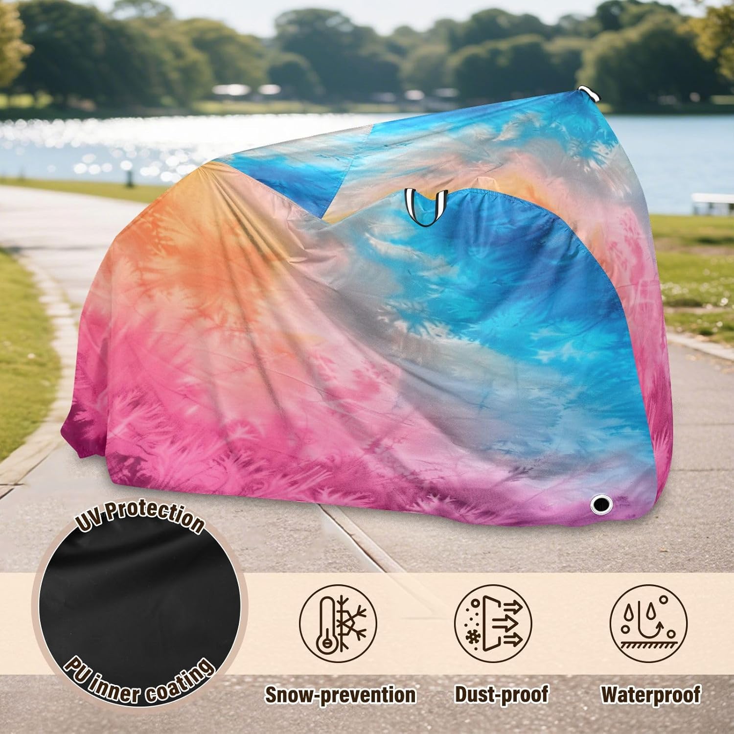 Protect your bicycle in style with our premium bike tarp, engineered for maximum defense against harsh elements. Unlike basic covers, we use specially engineered umbrella waterproof fabric - the same advanced material used in high-end rain umbrellas - delivering superior performance with unique visual appeal. Sun & Heat Defense Our fabric creates a physical cooling barrier that actively lowers your bike's temperature by: Blocking 95%+ harmful UV rays to prevent paint fading Providing exceptional shading & heat insulation (up to 20℉/11℃ reduction vs direct sun) Offering SPF 50+ equivalent protection for sensitive components Rain & Dust Protection Water-repellent coating causes rain to bead and roll off Tightly woven fabric acts as dustproof barrier for long-term storage Prevents moisture buildup with breathable side panels (prevents condensation) User-Focused Design LOCK ACCESS HOLE at front wheel enables secure locking without removing cover ADJUSTABLE BUCKLE STRAP at rear wheel anchors cover during strong winds Reflective safety strips on handles enhance nighttime visibility Ultra-lightweight (23 oz) folds into included pouch Unbeatable Aesthetics Choose from over 1,000 designer patterns - from sleek geometrics to vibrant nature motifs - transforming your bike into a street-style statement while competitors offer only solid colors.