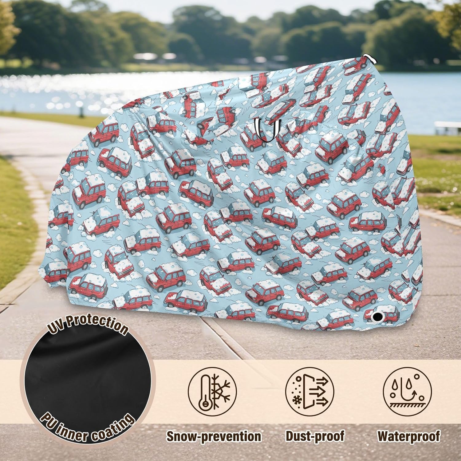 Protect your bicycle in style with our premium bike tarp, engineered for maximum defense against harsh elements. Unlike basic covers, we use specially engineered umbrella waterproof fabric - the same advanced material used in high-end rain umbrellas - delivering superior performance with unique visual appeal. Sun & Heat Defense Our fabric creates a physical cooling barrier that actively lowers your bike's temperature by: Blocking 95%+ harmful UV rays to prevent paint fading Providing exceptional shading & heat insulation (up to 20℉/11℃ reduction vs direct sun) Offering SPF 50+ equivalent protection for sensitive components Rain & Dust Protection Water-repellent coating causes rain to bead and roll off Tightly woven fabric acts as dustproof barrier for long-term storage Prevents moisture buildup with breathable side panels (prevents condensation) User-Focused Design LOCK ACCESS HOLE at front wheel enables secure locking without removing cover ADJUSTABLE BUCKLE STRAP at rear wheel anchors cover during strong winds Reflective safety strips on handles enhance nighttime visibility Ultra-lightweight (23 oz) folds into included pouch Unbeatable Aesthetics Choose from over 1,000 designer patterns - from sleek geometrics to vibrant nature motifs - transforming your bike into a street-style statement while competitors offer only solid colors.