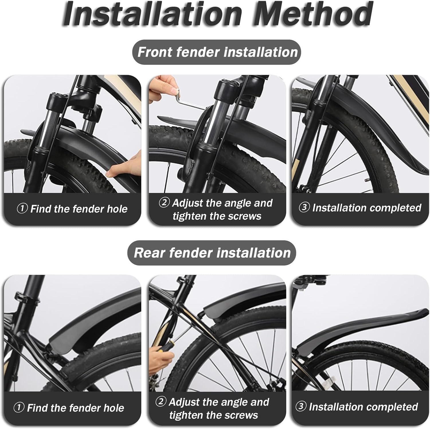 🛒We specialize in auto, motorcycle, and bicycle accessories❗❗⭕Have you ever been splashed with mud or water while riding your bike?✔️Use Bike Fender and Reduce splashes, enjoy a cleaner ride!! 💡What benefits can it bring to you?When riding on a wet or muddy road, your clothes can easily get soaked and your back can easily get covered with mud. Installing a bicycle mudguard can help block splashes of water and mud during riding, keeping you and your bicycle clean and dry. Mudguards can provide reliable protection in any weather conditions📋Specifications:⋆ Product name: Bicycle fender⋆ Material: Premium material⋆ Color: Black⋆ Applicable season: All year round⋆ Applicable models: 26-27.5-29 inch bicycles, both front and rear forks must be equipped with mounting holes and metal mounting brackets📦 Package Includes:⋆ 1 × Front Bike Fender⋆ 1 × Rear Bike Fender🧰 Note: Front and rear fender installation method is the same🔧Installation method1. Find the mudguard hole2. Adjust the angle and tighten the screws3. The front and rear mudguards are installed⚠️【Notes】1. Due to the light and screen setting difference, the item's color may be slightly different from the pictures2. Please allow slight dimension difference due to different manual measurement📞【Customer Support】If you find the product is not compatible with your bike, or there is any problem with the product, please feel free to email us, we will respond as soon as possible and do our best to assist you
