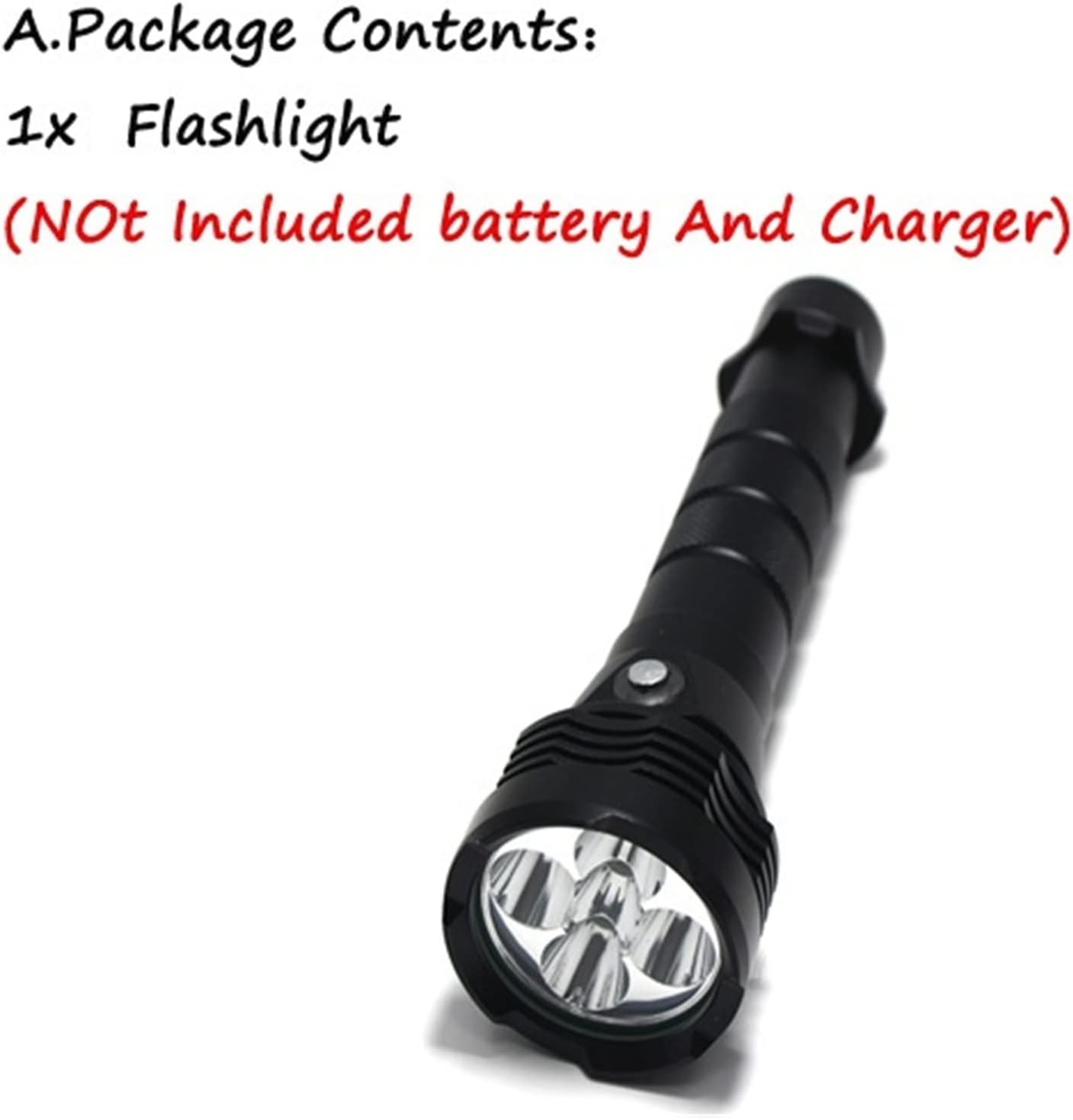 1.This torch uses of 5*XM-L L2 LED, producing very bright beam of light. 2.Output bright can come to above 8000 lumens [lm] 3.Internal wiring applies the high efficient booster circuit, and can utilize the batteries in the largest extent 4.The body of this flashlight is built of aircraft-grade aluminum alloy, and it has a very solid construction. 5.Hard-Anodized finish; Anti-abrasive, free-scratch, shock-proof. Specifications: 1.Emitter Type: 5x XM-L L2 LED 2.Light Color: White 3.LED Quantity: 3 4.Battery Configurations:2x18650 or 2x 26650 5. switch Mode: 3-mode 6.Brightness: 8000 lumens 7.LED Lifespan: 100,000 hours 8.Material :Aluminum 9.Lens: Coated Glass Lens 10.Reflector: Aluminum smooth reflector 11.Casing Color: Black Note: Press switch with LED : green for full capacity and red for lack of capacity. if your 18650 battery have not enough output current, even our flashlight are in good condition, it can't working successfully due to not reach the minimum current requirement. A.Package Contents: 1x Flashlight(NOt Included battery And Charger) B.Package Contents: 1 x Flashlight 2 x 18650 battery 1 x Charger C.Package Contents: 1 x Flashlight 2 x 26650 battery 1 x Charger This diving flashlight is mainly used for diving works, underwater fishing operations, salvage operations underwater archaeological work, teaching Scuba diving. It's also an ideal choice for outdoor activities, such as fishing, diving, swimming, hiking, caving and seeking survival without fear of rainy days.