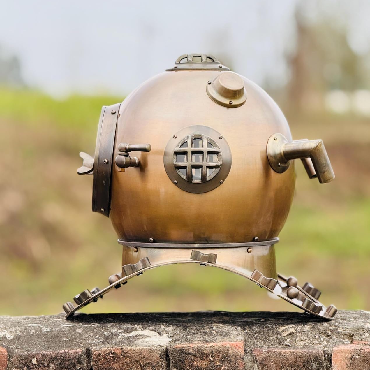 Bring the charm of deep-sea exploration into your space with this vintage-style diving helmet. Constructed from solid steel and aluminum, this full-size helmet features authentic design details that make it an excellent decorative accent. Standing 18" tall with top head dimensions of 16" x 12.5" x 17" (40 x 32 x 42 cm), it fits perfectly on tables, desks, or display shelves. Designed for nautical décor enthusiasts, this collectible helmet combines durability with timeless maritime appeal, making it a standout addition to any home, office, or themed collection.