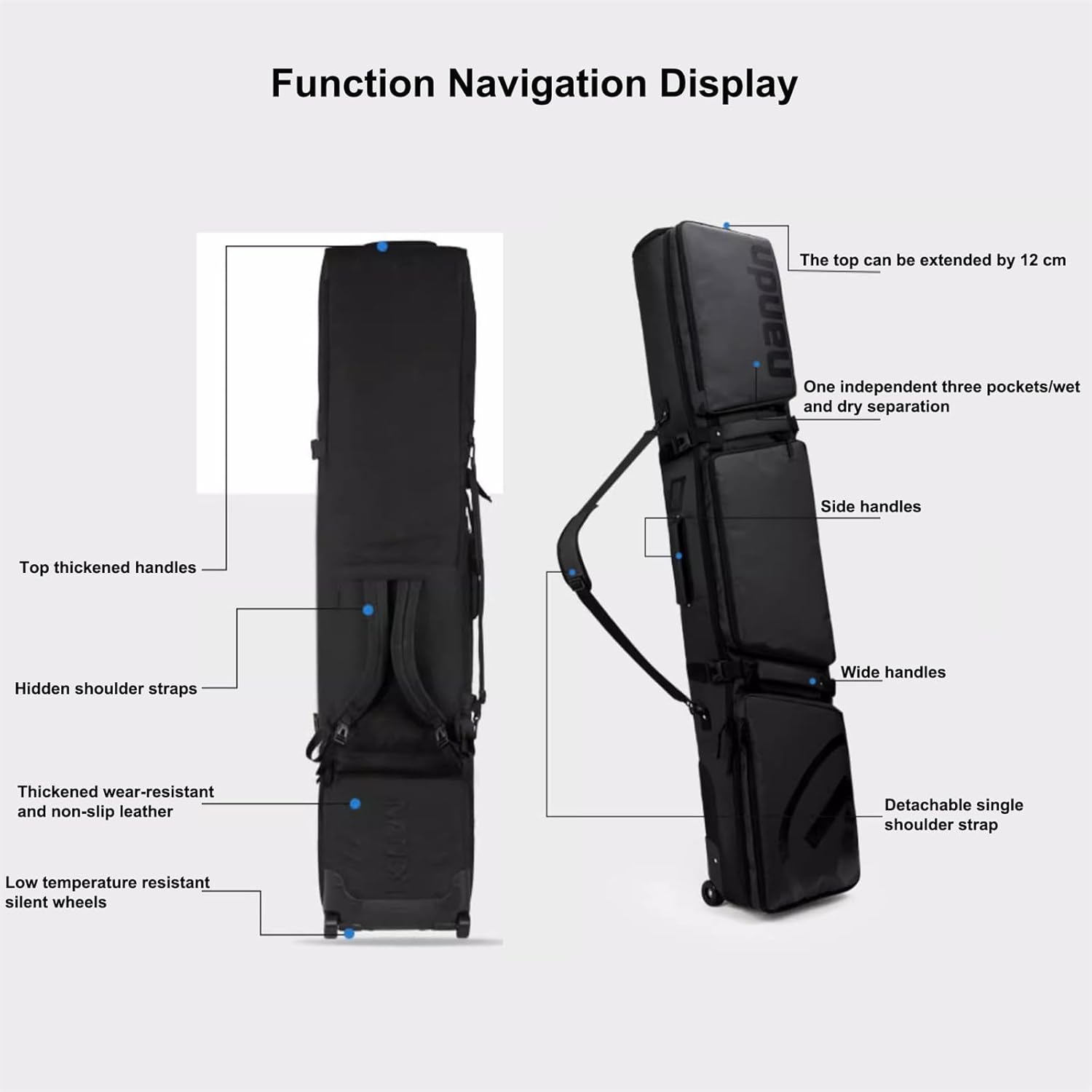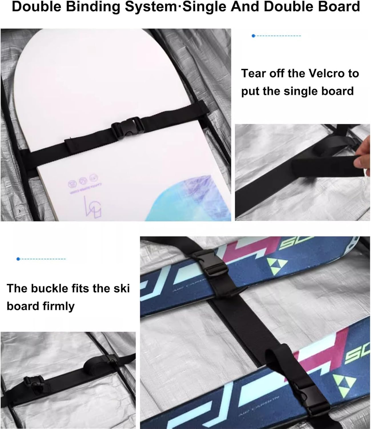 Pack The Boards and Hit the Snow!The Expandable Double Snowboard Bag lets you travel with ease and flexibility.Roll it in the airport or carry it as you hike up a mountain. Expandable Snowboard Bag is made to be equipped with resistant rubber wheels, stowaway backpack shoulder straps, and a removable padded shoulder strap. You get 4 robust carry handles so you can grab, carry, stack, and roll the bag with no trouble and no scratches! The bag folds into one compact package when not in use, making storage stress-free.Product name: Double Rolling Ski BagFabric: TPU+mesh materialWheels:Silent tank wheelsColor: White, black, blue, purple, greenSize:(64.9~69.7)×14.2×7.1 inch/(165~177cm)×36×18cmFolded size: 50*39*20cmGross weight: about 4.5kgPackaging weight: about 4.8kgUse: Ski equipment, wet and dry separationIncludes:1× Double Rolling Ski Bagnote:1. Due to the use of different shooting tools, slight color errors may occur. This is not a quality issue. Please refer to the actual product2. Because it is manual measurement, the error is 1-3cm, please refer to the actual product, please understand