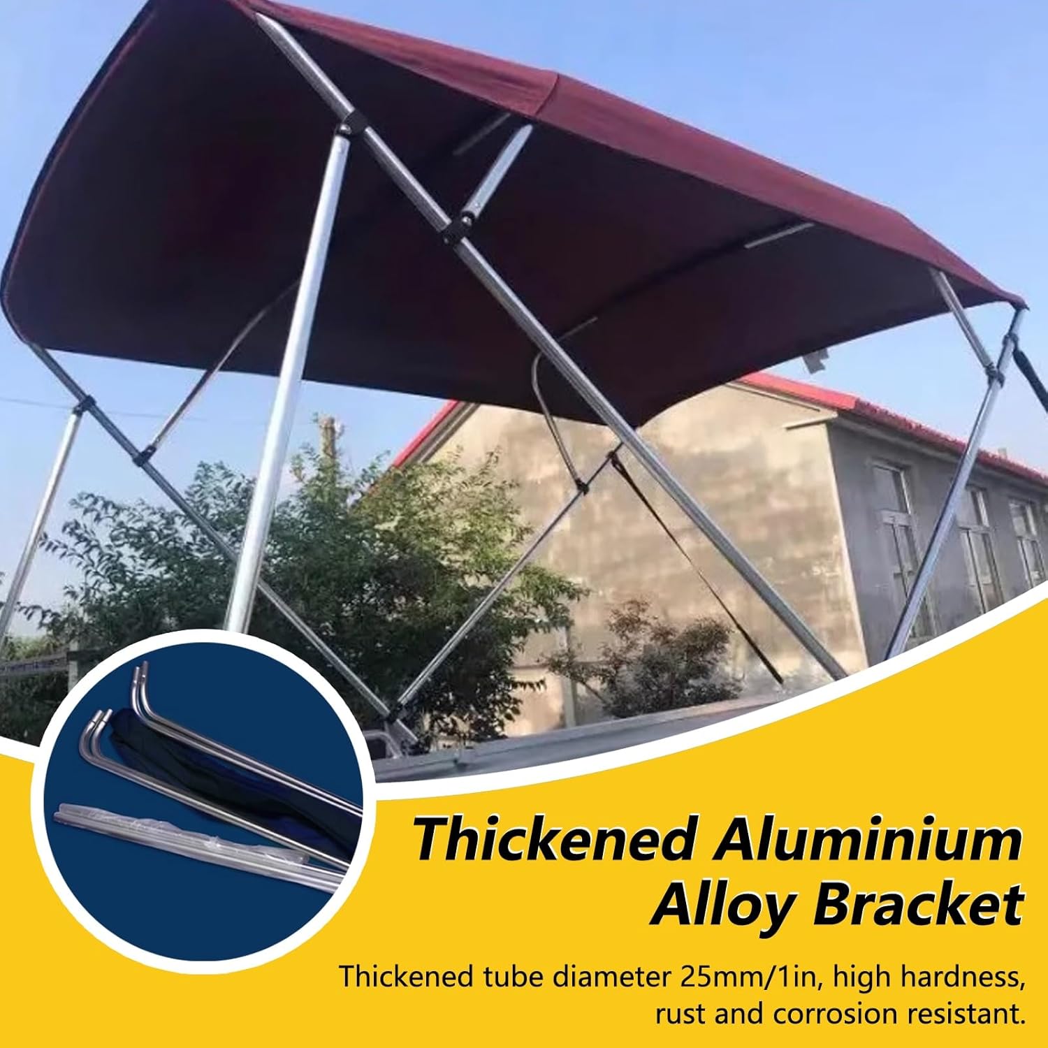 The Oxford cloth coating has undergone a special treatment process, making it not only highly tear-resistant, but also rainproof, sunproof, and durable.Whether it's blocking the glaring sun while fishing on the lake in the morning, providing shade for the lounge area during an afternoon yacht party, or serving as a temporary rain shelter during a sudden downpour, this boat canopy is suitable for a variety of scenarios.Product SpecificationsName: Boat sun shadeMaterial: Waterproof Oxford cloth, aluminium alloyColour: BlackNumber of Bows: 3Product SizeLength: 182cm/72inHeight: 117cm/46inWidth: 137-152cm/54-60in155-167cm/61-66in170-182cm/67-75in185-198cm/73-78in200-213cm/79-84inPackage Includes1 x Boat cover canopy (with mounting accessories)The base is a hard boat-specific base, installed with screws.AttentionRemember to take the awning back home when there is a typhoon.
