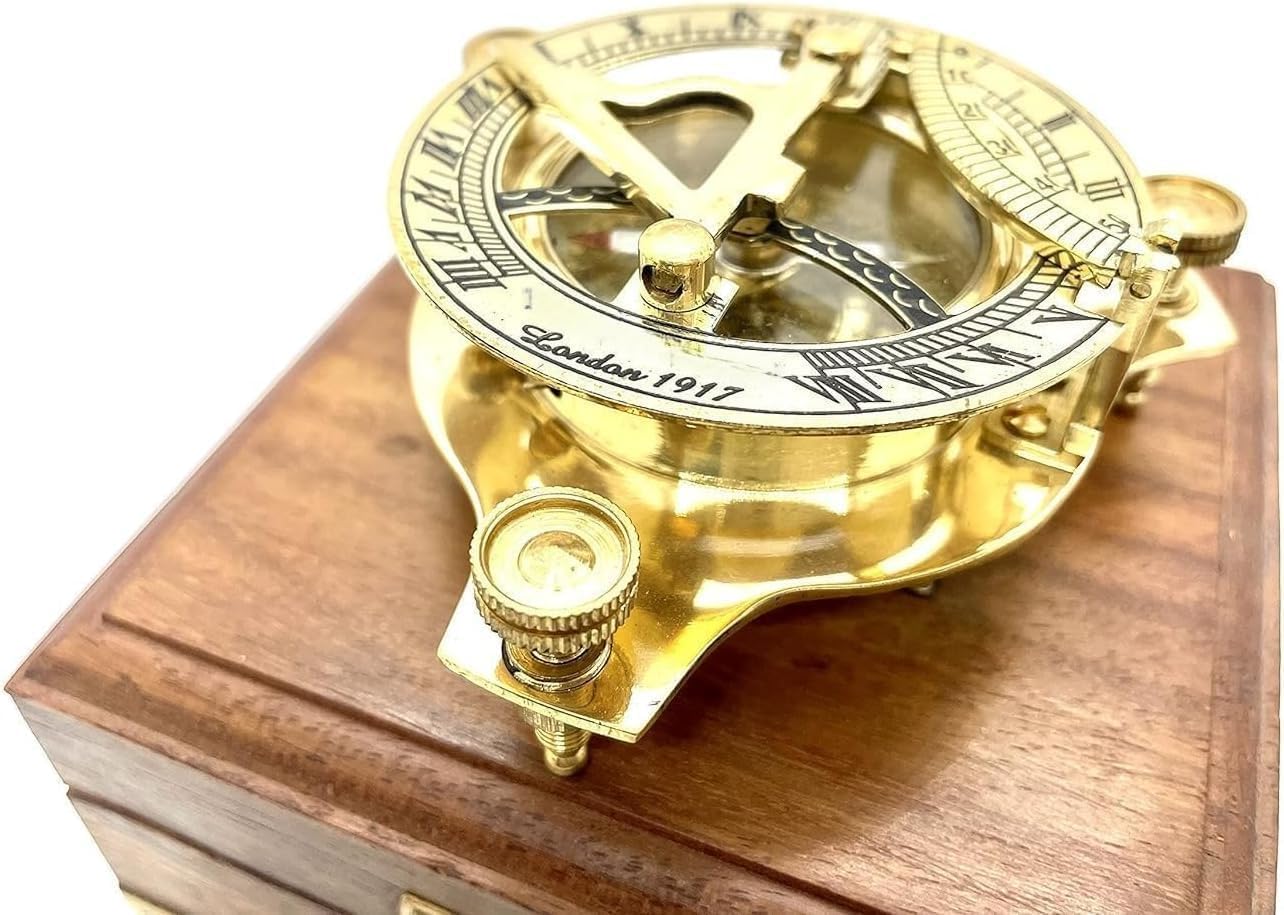 Step back in time with this exquisite handmade brass sundial compass, a masterful blend of vintage aesthetics and practical navigation. Measuring 2.5 inches and weighing 150 grams, this portable compass features intricate Roman numerals and precise markings that harken back to traditional maritime navigation tools. The gleaming brass construction offers both durability and timeless appeal, while the included wooden box provides elegant storage and protection. This multipurpose instrument serves as both a directional compass and a solar timepiece, making it an invaluable companion for outdoor adventures. Perfect for hiking, camping, and wilderness exploration, it requires no batteries and maintains functionality through simple solar positioning. The pocket-sized design ensures easy carrying during your expeditions, while its authentic vintage styling makes it an impressive display piece when not in use. Whether you're an outdoor enthusiast, collector of nautical instruments, or seeking a distinctive gift for a special occasion, this sundial compass combines both form and function in a remarkable way. Each piece showcases detailed craftsmanship, making it not just a practical tool but also a conversation-starting accessory that celebrates the art of traditional navigation.