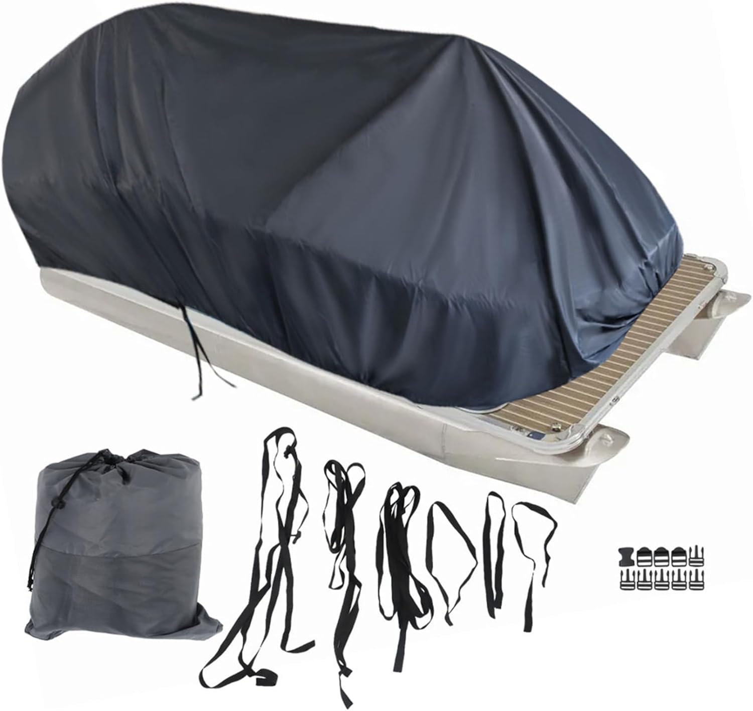 Pontoon Safety Protective Heavy Duty Boat Blue CoversKey Features:-Water Resistance-Tight Double Stitch-Double Buckle Adjustment Strap-Easy to Use-Large Cover SizeSpecifications:Color: GaryDimension: 307.09" x 151.57"Material: Outside: PEVA. Inside: Thick soft cotton liningApplication: Fit Boat Length:21"-24", Beam width: up to 102" (Fit Flat bottom Boats with beam width up to 102" )Package Included:1 x Boat Cover5 x Straps1 x Storage BagAttention:1.Pay attention to maintenance and dry in time.2.Make sure to use Boat Cover Support to extend the life of your boat cover by preventing water from pooling on top.
