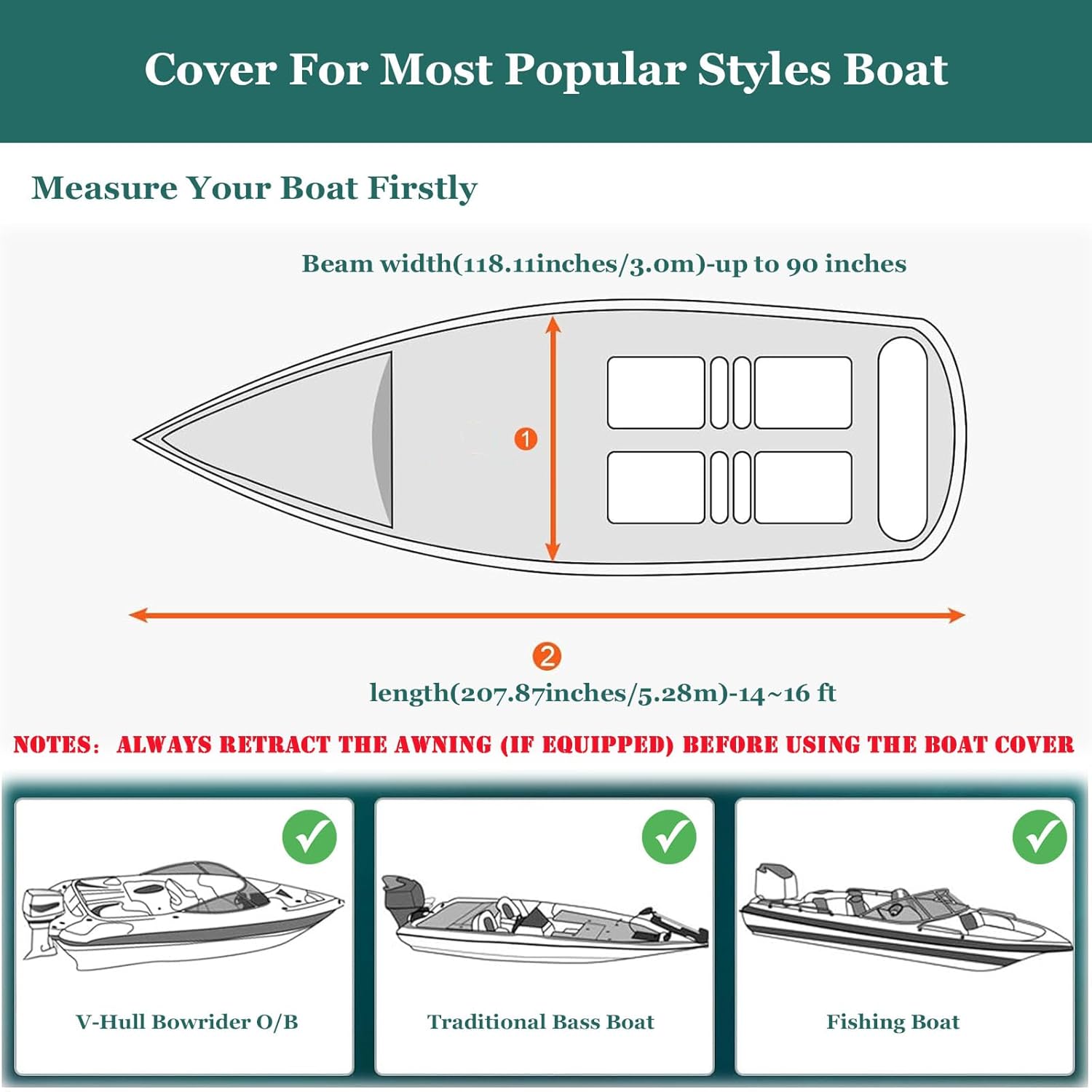 | Coverage | Full exterior coverage for various types of boats (bass, fishing, V-hulls, three-hull planing, trailerable boats) |