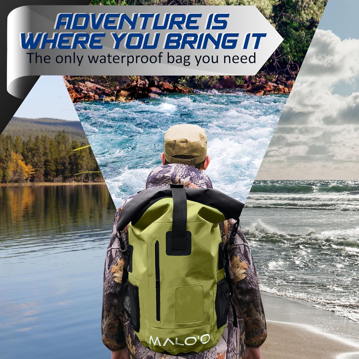 Built for water, travel, and everyday adventure, the Malo’o DryPack 30 Liter Waterproof Backpack delivers dependable protection and comfort wherever the day takes you. Designed with a roll top closure and welded seams, this dry bag backpack helps keep your gear dry through rain, splashes, wet sand, and changing conditions on land or water. Crafted from rugged 500D PVC tarpaulin, the DryPack is made to handle demanding outdoor use while remaining lightweight and comfortable to carry. The roll top design allows you to adjust the size based on your load while creating a secure seal for wet environments. When properly sealed, the backpack is designed to float, making it a reliable choice for kayaking, boating, paddle boarding, fishing, and beach days. Thoughtful storage keeps your essentials organized on the go. An internal zip pocket helps protect valuables, while the exterior clear pocket provides quick access to frequently used items. Side pockets add convenience for water bottles or accessories, so everything stays within reach during your adventure. Comfort is built into every carry. Padded ergonomic shoulder straps and a breathable back panel help reduce pressure and heat buildup, allowing you to wear the DryPack comfortably for extended periods. Whether you are hiking, traveling, or hauling gear to the shoreline, the balanced backpack design supports all day wear. With a versatile 30 liter capacity, this waterproof backpack is ideal for towels, extra clothing, food, electronics, and daily essentials. From beach trips and water sports to travel and everyday use, the Malo’o DryPack delivers reliable weather protection, smart organization, and adventure ready durability in one clean, functional design.