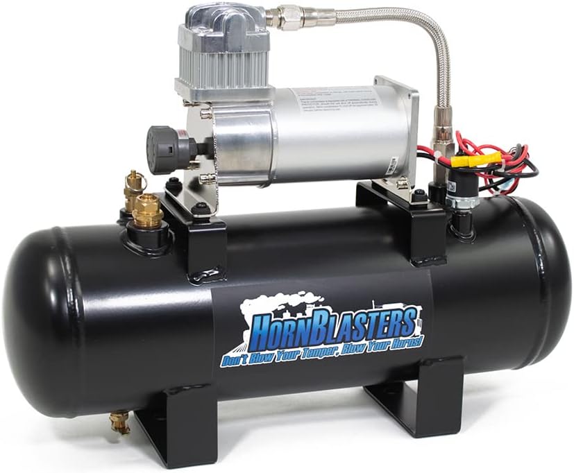 All-inclusive Air Horn Solution 120 PSI 2-Gallon Air Source Unit Complete With Everything Needed For The Install From Start To Finish! Honk Time = 3-5 Seconds Pre-installed Fittings & Electric Air Valve