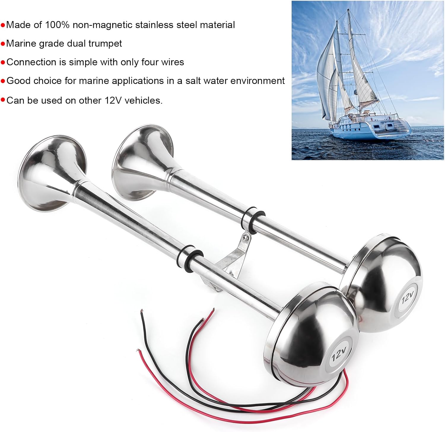 Condition: Brand NewItem Type: Dual TrumpetColor: SilverMaterial: Stainless SteelLarge Trumpet Length: Approx. 460mm/18.1inSmall Trumpet Length: Approx. 395mm/15.6inDiameter: Approx. 105mm/4.1inVolt: DC 12VCurrent: 10.0ASound Level: 125dbFrequency: 380HzClass: Marine classTrumpet Type: Electric Trumpet (Work directly when connected to electricity)Package List:1 x Dual Trumpet2 x Black Rubber Pad1 x Accessory Bag