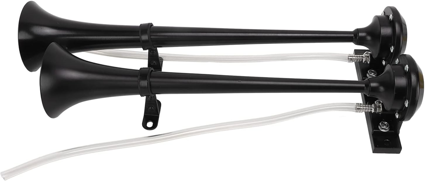 [LOUD 130DB DUAL TRUMPET SOUND] Experience powerful 130dB sound output with this dual trumpet air horn designed to grab attention instantly. for ensuring safety on busy roads or waterways the loud and clear sound can be heard from a great distance.[UNIVERSAL 12V COMPATIBILITY] This air horn works seamlessly with any 12V power supply making it ideal for cars trucks boats yachts off road vehicles and buses. Its versatile design ensures easy integration into your existing vehicle setup.[PREMIUM METAL CONSTRUCTION] Built with high quality metal materials this dual trumpet horn offers exceptional durability and longevity. It withstands harsh weather conditions and extreme temperatures ensuring reliable performance year after year.[QUICK AND EASY INSTALLATION] Comes complete with all necessary mounting hardware and accessories for a hassle setup. The straightforward installation process allows you to get your new air horn up and running in no time.[PROPER INSTALLATION GUIDELINES] For optimal performance mount the compressor vertically away from hot engine parts and position the horns slightly downward. Following these simple steps ensures maximum efficiency and longevity of your air horn.Spec:Item Type: Dual Trumpet HornMaterial: MetalVoltage: DC 12VCurrent: 20.0 ASound Level: 130 dbOperating Pressure: 0.1mpa ~ 0.15mpaApplicable :Universal replacement of truck, car, train horn, suspension, ride, package, systemSuitable for all 12V vehicles, yachts and vesselsNote: