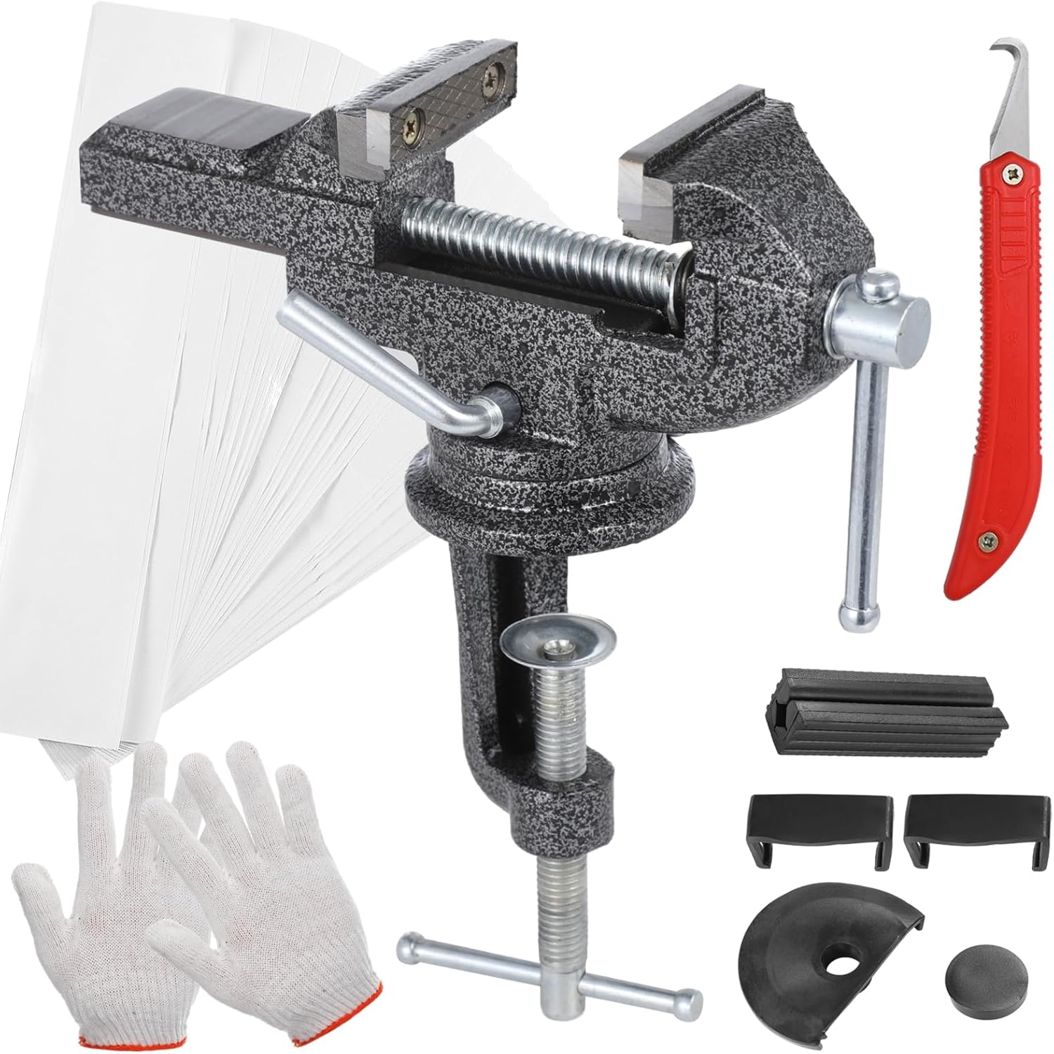 Color:Black Material:Steel Silicone Vise Clamp Size: 7.5 * 5.7 * 2 inches Package Includes:1 * Vise Clamp, 1 Pair of Gloves, 20 * Double-Sided Taps, 1 * Hook Cutter, 1 * Shaft Protector Sleeve, 2 * Silicone Mounting Bracket, 1 * Stabilizer Pad, 1 * Cushioning Disc Note: - Please refer to the measurement. Tiny measuring error is allowable in normal range. - There might be a little color difference due to the monitor, camera or other factors, please refer to the physical item.