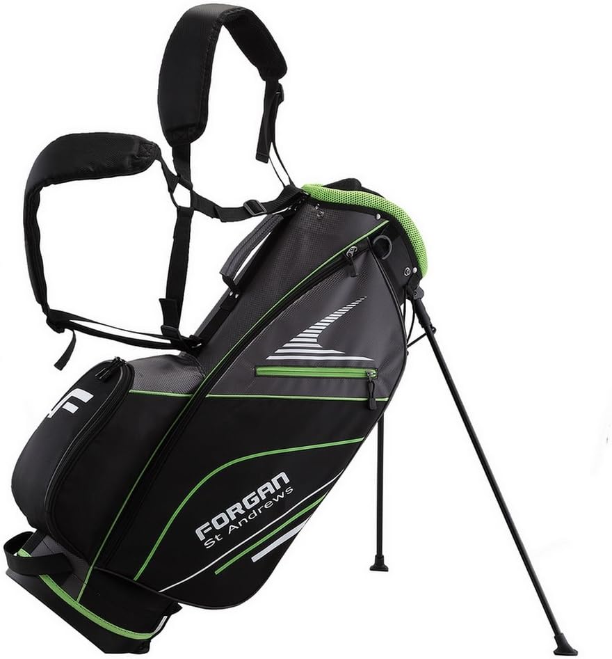 The Super Lightweight golf bag range from Forgan of St Andrews removes non-essential weight with high tech materials and clever design without compromising on quality or essential features.Weighing in at approximately 4lbs, this lightweight golf carry bag features built in auto-pop out stand legs so you can easily and quickly set the bag down.The bag has a 9", 7 way divider top with 3 full length dividers to help keep everything in place.There's also an external umbrella holder, 1 full length pockets for your apparel, 4 zipper pockets, a balls pocket, valuables pocket, velcro glove tab and more!9" 7 way divider top - 3 full length dividers4 zipper pockets1 ball pocket only1 valuable pocket1 full length pocketAdjustable dual strap with padded2-point shoulder strapEVA molded hip padRain hood includedPlastic towel ringVelcro G