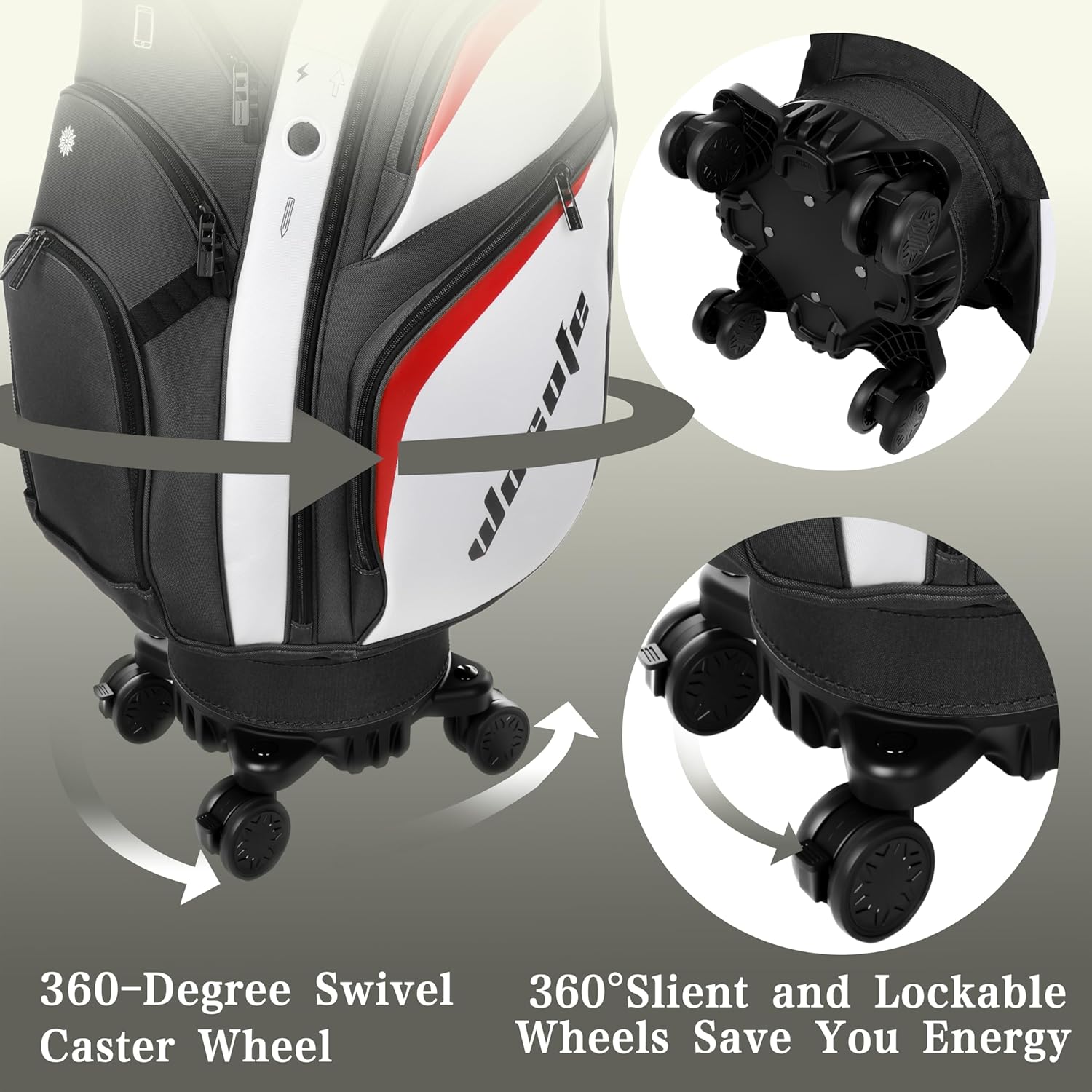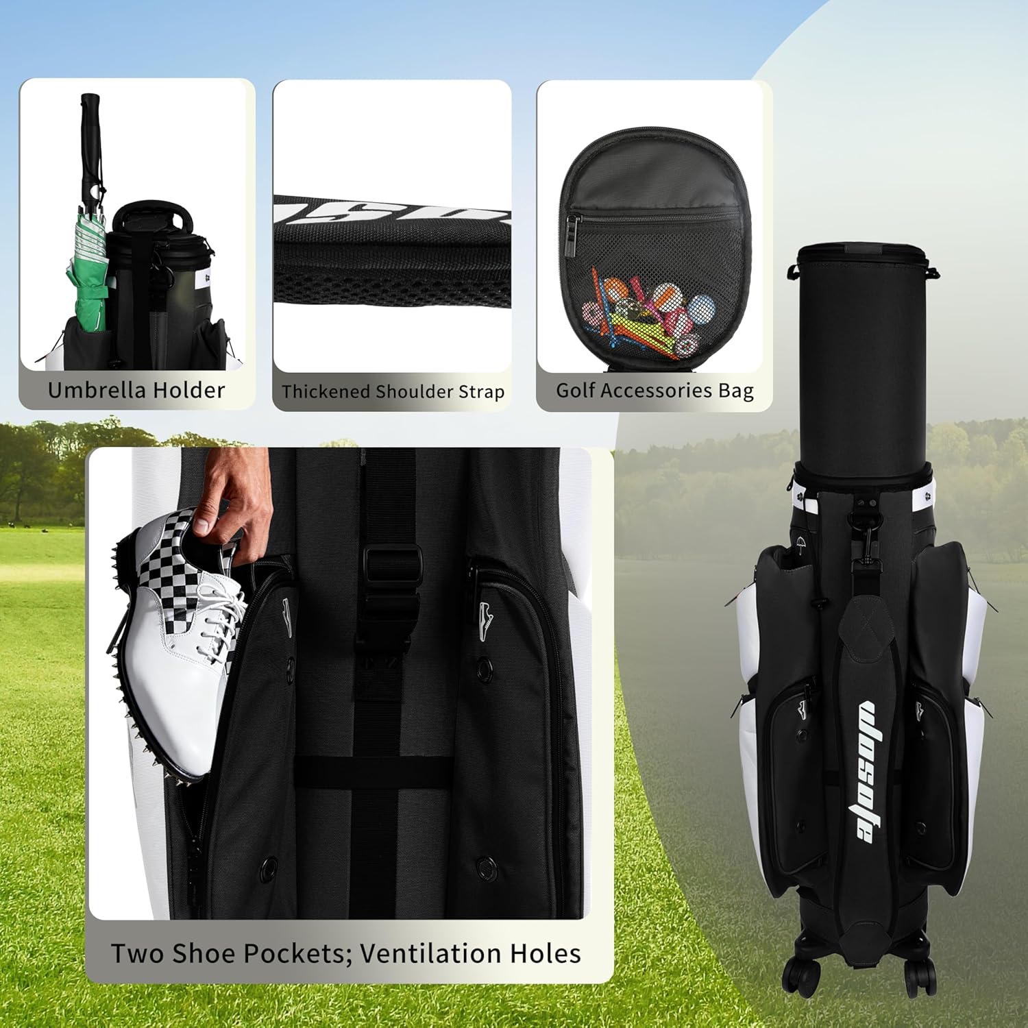 Retractable Hard Top Protection:6 separate compartments keep your driver, irons and putter organized, reducing collisions. The hard retractable top offers full protection during travel and can be used as a regular golf bag. 360° Silent Lockable Wheels: Smooth-rolling, quiet wheels allow easy pulling/pushing at airports, golf courses or any surface. Lockable design prevents sliding, making your movement effortless. 11 Multi-Functional Pockets: Neatly store golf balls, rangefinder, tees, gloves, shoes, water, phone and more. All essentials are within reach, no more rummaging troubles. Convenient Details: Insulated cooling pocket holds 10 colas to keep drinks cold; dedicated power bank pocket with cable hole for easy phone charging on the course. Versatile & Durable: 360° wheels support dragging and golf cart mounting (2-in-1 travel/cart bag). Made of wear-resistant Oxford cloth, sturdy and perfect as a golf gift for golfers or Christmas. Add this practical golf travel bag to your cart now for a hassle-free golf journey!