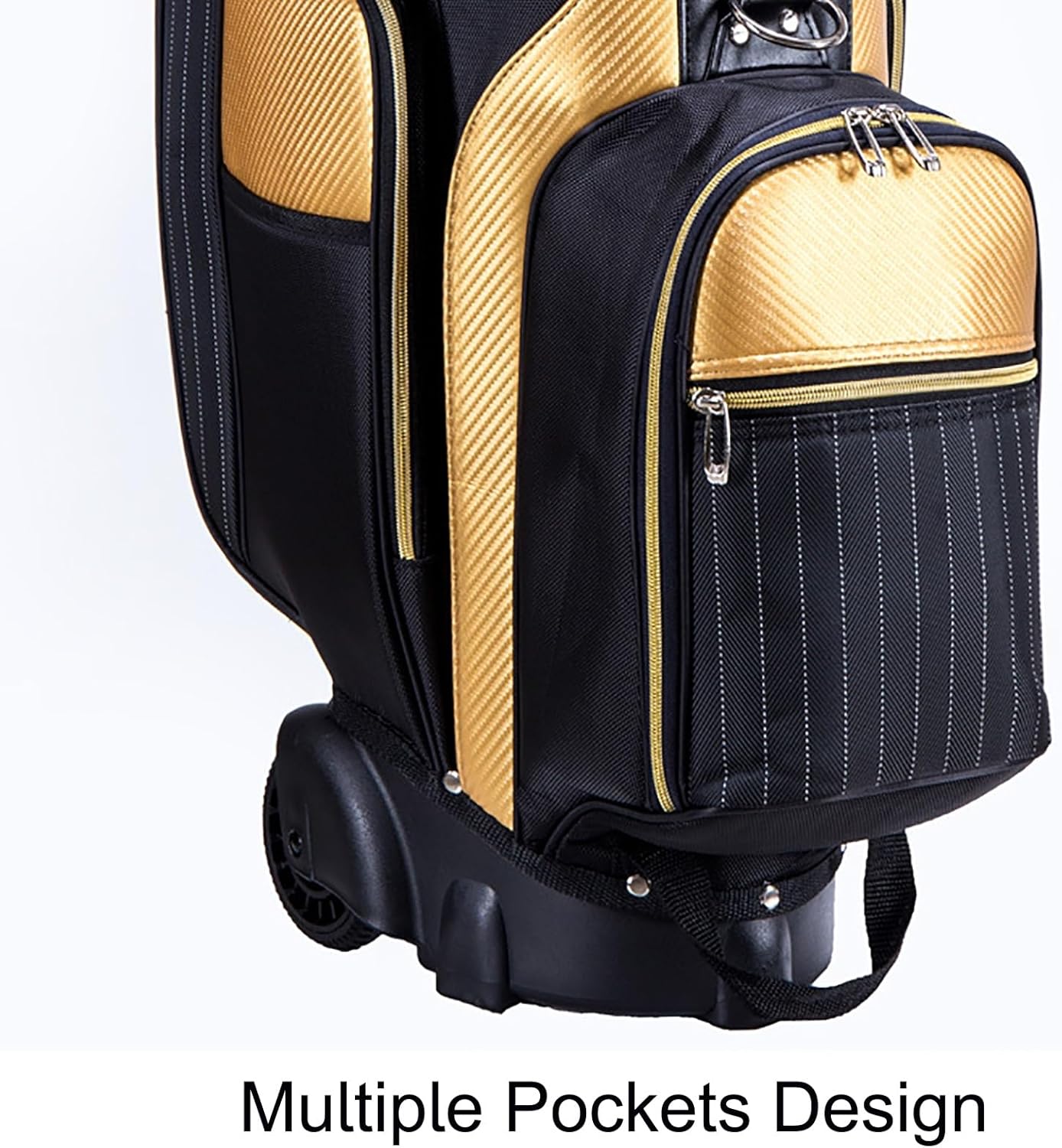 Golf carrying bag with wheels easy to carry and transport.Golf bag nylon fabric hat with ball bag anti-wrinkle and not easy to deform and wear-resistant material.Golf cart bag retractable rod design, easy to carry press the top button to retract and retract at will and the bag can be easily pulled.Golf club storage bag 5 Way Dividers side additional storage pockets you can put gloves balls TEE pins and other personal items.Golf transport bag with shoulder strap comfortable and adjustable ergonomic carrying position durable non-slip base can be safely placed in a trolley easy to move.Specification:Name: Golf BagColor: blackSize: 48.4x13.3inWeight: 9.5 lbsMaterial: Nylon fabricType of use: male/femaleUsage scene: travel/club/court/driving fieldNote: 1. Products are measured manually, there may be an error of 2-3cm, please refer to the actual situation.2. If you have any questions after receiving the goods, please contact us within 24 hours.