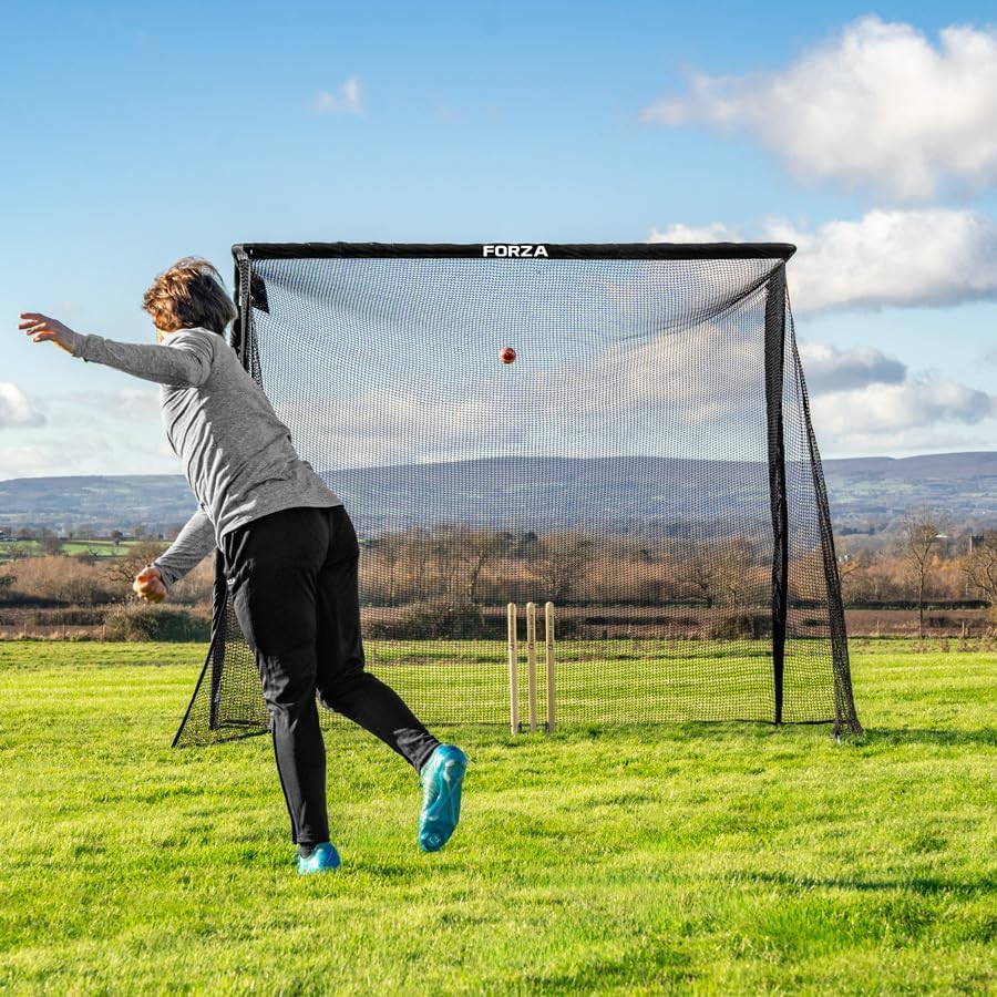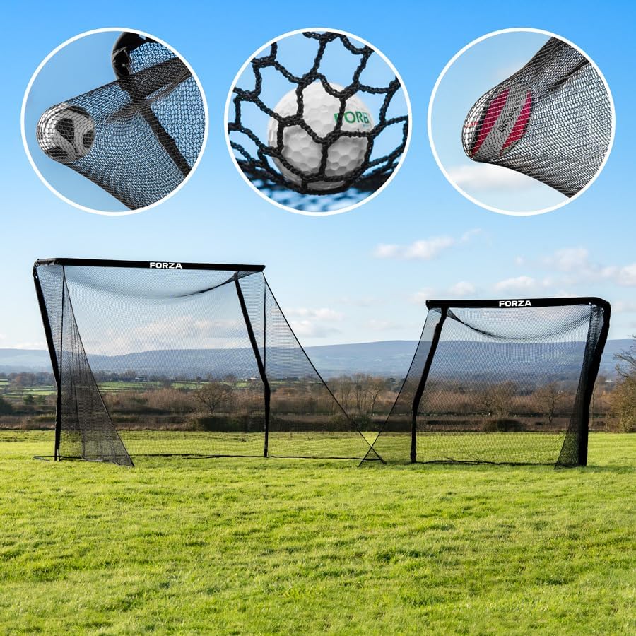 FORZA Pro Multisport Practice Net Return Wall SpecificationsDimensions:Standard (Assembled): 7ft H x 7.2ft W x 3.4ft D | 2.1m H x 2.2m W x 1m DLarge (Assembled): 8.3ft H x 10.2ft W x 3.8ft D | 2.5m H x 3.1m W x 1.2m DWeight:Weight (Standard): 23.2kg | 51lbsWeight (Large): 28.8kg | 63.5lbsMaterials:Heavy-duty powder-coated steel tube frameImpact-resistant weatherproof nettingHook-and-loop net attachmentMiscellaneous:Increased stability frame construction for outstanding resistance to ball ricochetsPerfect hitting wall for various ball sports, including soccer, field hockey, cricket, baseball, & lacrosseHigh-performance training net with automatic ball returnOptional carry bag available for easy storage & transport of your practice net wallPLEASE NOTE: Indoor golf training will require a golf practice mat to tee off from.PLEASE NOTE: The product is a golf practice net return wall only, sandbags, mats, tees, & balls not included.