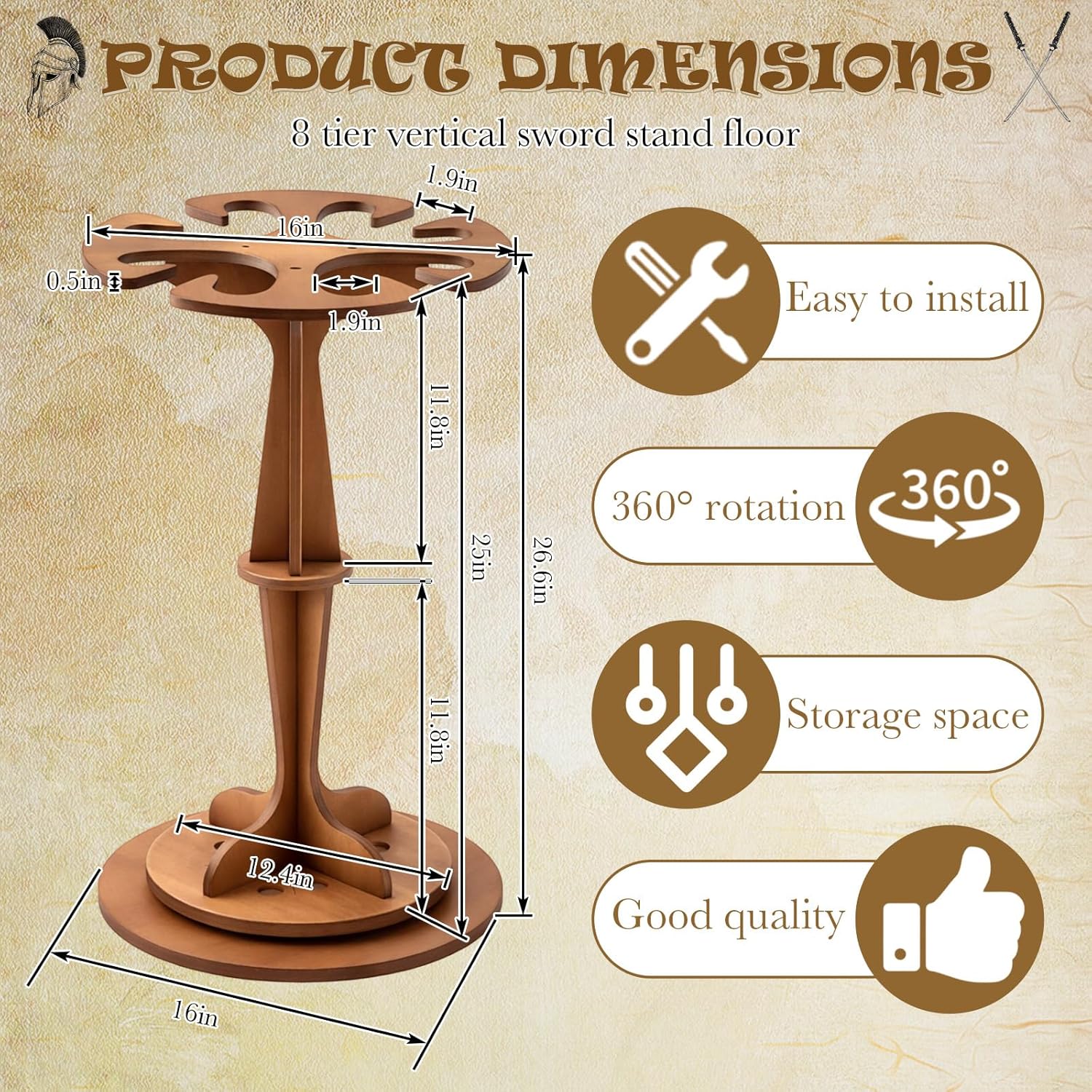 Features: The upright structure of this vertical sword display stand offers a space-conscious solution for your display needs. Its compact footprint is designed to not take up a large amount of floor space, making it a fitting addition to rooms of various sizes. This design allows you to showcase your collection effectively even in areas where space might be a consideration. Crafted from wood, this sword stand rack offers a solid and reliable structure for your collection. The wooden build provides inherent stability, giving the unit a firm base and a substantial feel. This material choice contributes to a traditional look that many collectors appreciate for displaying martial arts items. The construction is focused on providing a dependable platform for your display needs. Specifications: Material: wood Color: walnut wood color Size: 26.6 x 16 inches/ 67.6 x 40.6 cm Package includes: 1 X Wooden Sword Stand Notes: Manual measurement, please allow slight errors on size. The color may exist a slight difference due to different screen displays