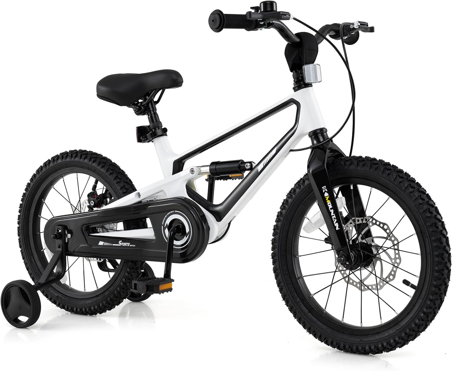 Description:Our 16 inches kids' bike is a perfect option for 4-7 years old young riders to learn to ride. The 95% pre-assembled kids bike makes installation a breeze. It comes with 2 training wheels for beginners to keep balance. When not in use, the training wheels can also be removed. The bicycle will grow with children. You can adjust the height of the handlebar and seat to find the optimal height for your little one. Easy-to-grip handlebars and dual disc brakes allow kids to easily control the speed and stop the bike. More importantly, the bike features an anti-deform magnesium alloy frame and inner brake cables. It also comes with safe reflectors and anti-slip foot pedals for extra safety.Features:Adjustable seat & handlebar make it suitable kids of different heightsEnduring magnesium alloy frame for portability and long-term useOur inner brake cables are better than other external brake cablesFully enclosed chain guard for safe ridingDesigned with a safe brake system: handbrakes and dual disc brake2 removable training wheels to help kids learn to ride and keep balanceAnti-slip foot pedals for safe pedaling3-layered rubber wheels( rubber outer, tire chafing strip, and inner tire) for long-lasting ridingIdeal for cement floors, boardwalks, asphalt roads, and moreFun riding gift for kids aged 4 to 7Perfect for building strength, improving balance, and developing self-confidenceFront and back reflectors ensure easier visibility to others2 detachable training wheels help beginners gain confidenceBicycle bell brings additional funIncluded tools for fast assemblyExcellent shock absorption for a smooth riding (Rear Suspension Ones)Specifications:Wheel Size: 16"Rigid Ones:Color: Black/ BlueMaterial: Magnesium Alloy, Metal, Rubber, PPOverall Dimensions: 44" x 21.5" x 25.5"-28" (L x W x H)Seat Size: 9" x 5"(L x W)Recommended Age: 4-7 Years OldRider's Height: 41.3"-51.2"Saddle Height: 21.5"-25.5"Inseam Size: 20.5"-24"Weight Capacity: 145 lbsNet Weight: 20 lbsRear Suspension Ones:Color: Pink/Blue/WhiteMaterial: Magnesium Alloy, Rubber, PP, PVC, SpongeProduct Dimensions: 45" x 21"x 25.5-28"(L x W x H)Saddle Dimensions: 8.5" x 5.5" (L x W)Saddle Height: 23"-27"Wheel Size: 16"Rider's Height: 41.3"-51.2" Weight Capacity: 145 lbsSuitable Age: 4-7 Years OldNet Weight: 22 lbsPackage Includes:1 x Kid's Bike1 x Instruction