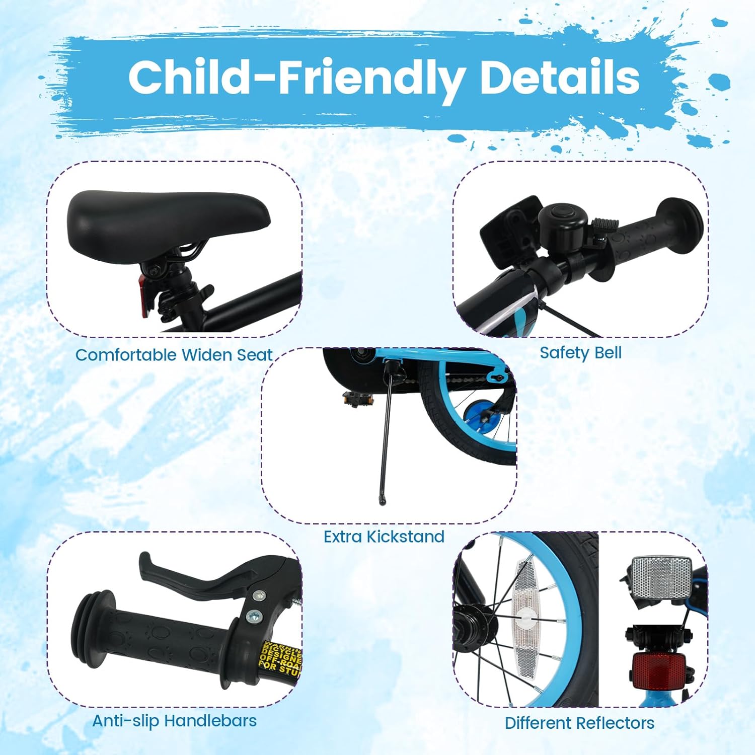 Description: OLAKIDS bike for boys age 4-7 is the perfect companion for child’s cycling adventures and a fantastic all-in-one growth partner that combines fun, functionality and safety! It comes with a playful DIY drawing board, allowing kids to unleash their imagination and creativity through vibrant coloring—turning every moment off the bike into a joyful "learning through play" experience. Designed to grow with child, this girls bike comes thoughtfully equipped with detachable TRP anti-slip training wheels and a height-adjustable saddle. The dual-brake system and enclosed chain guard create a solid safety barrier for young riders. When it comes to material, this toddler bike with training wheels is equally impressive. The 18’’ bike is equipped with a kickstand to meet parking needs. To make things even easier, this bike arrives 85% pre-assembled, allowing for quick and hassle-free setup that saves parents precious time and effort.